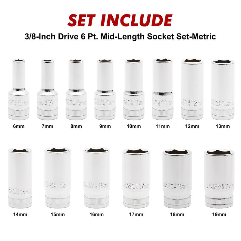 ·14PCS 3/8" Drive 6 Pt. Mid-Length Socket Set Include: 6, 7, 8, 9, 10, 11, 12, 13, 14, 15, 16, 17, 18, 19 mm.