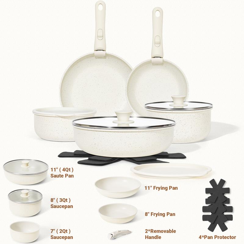 ·Complete Set : SODAY 15 pieces cookware set includes 1pcs 11" Saute Pan,1pcs 8&10.6"Frying Pans, 1pcs 2QT Sauce Pan & 3QT Sauce Pan, 2* Removable Handle, 8&11"Glass Lid, 4*Pot Protectors, 2*Fridge Storage Lid. From sauteing to simmering, our pots and pans set provides versatile cooking optionsto suit your culinary needs.
