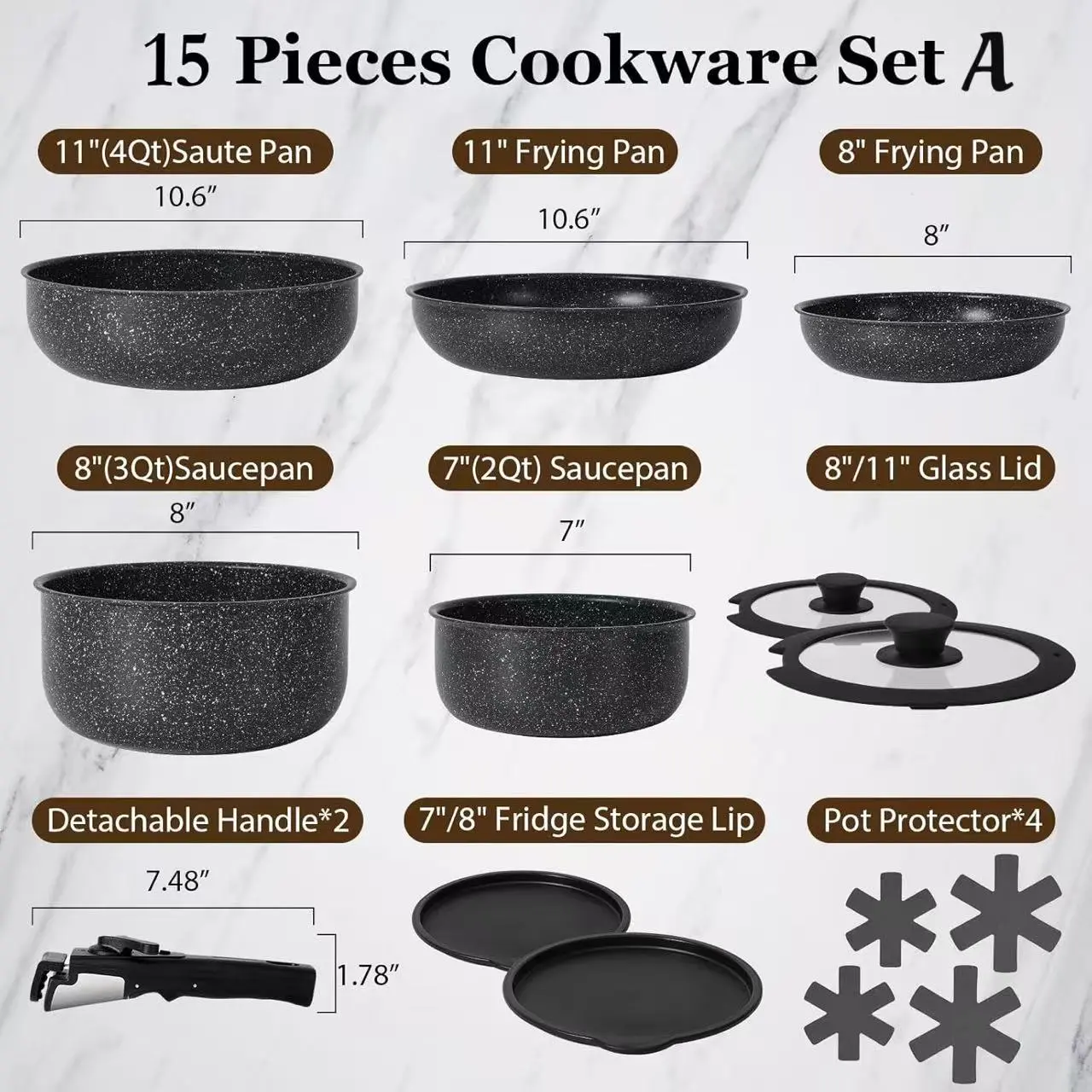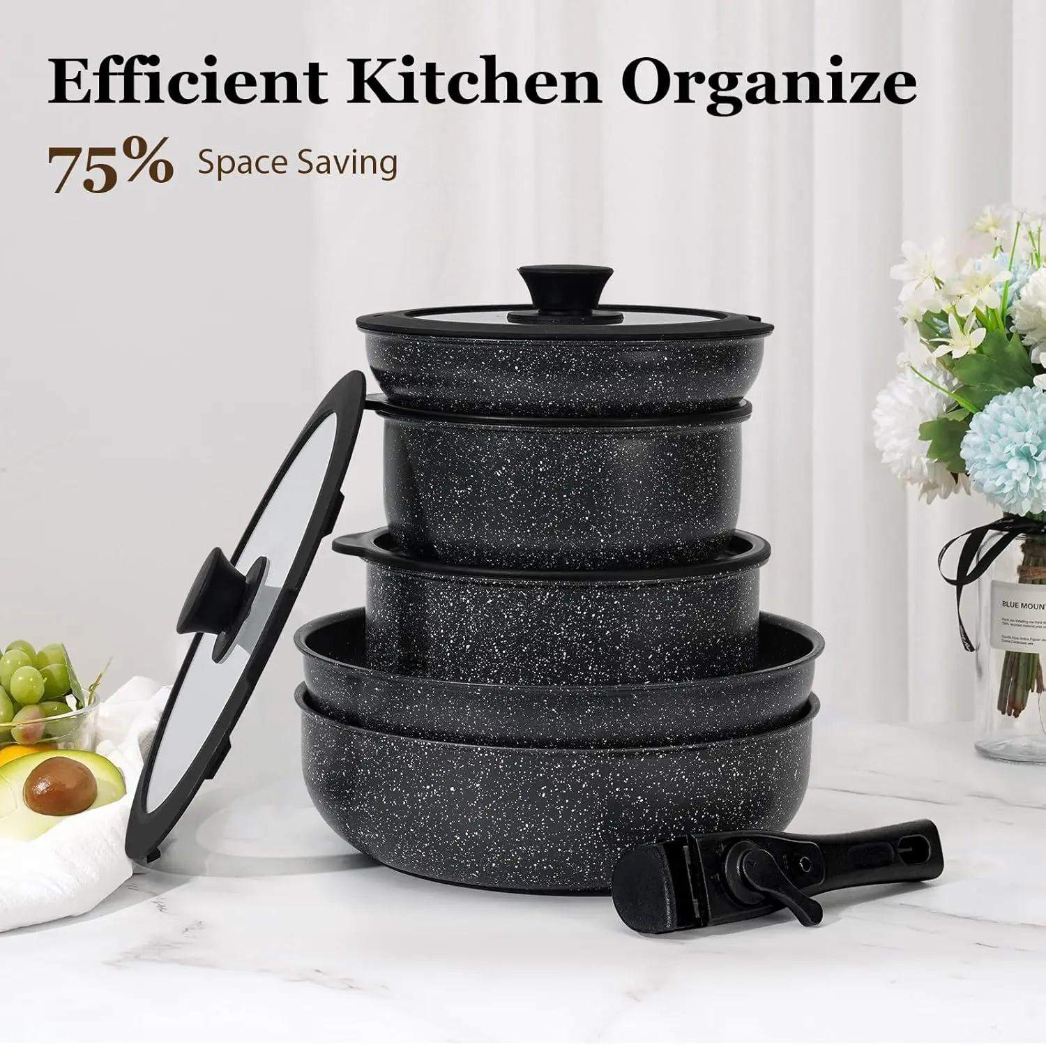 ·Efficient Storage: Pots and pans set with detachable handles allow for compact nesting, optimizing 70% kitchen cabinet space and providing a clutter-free cooking environment,making for easy storage in cabinets or RVs.