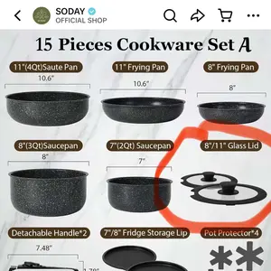 ·Complete Set : SODAY 15 pieces cookware set includes 1pcs 11" Saute Pan,1pcs 8&10.6"Frying Pans, 1pcs 2QT Sauce Pan & 3QT Sauce Pan, 2* Removable Handle, 8&11"Glass Lid, 4*Pot Protectors, 2*Fridge Storage Lid. From sauteing to simmering, our pots and pans set provides versatile cooking optionsto suit your culinary needs.