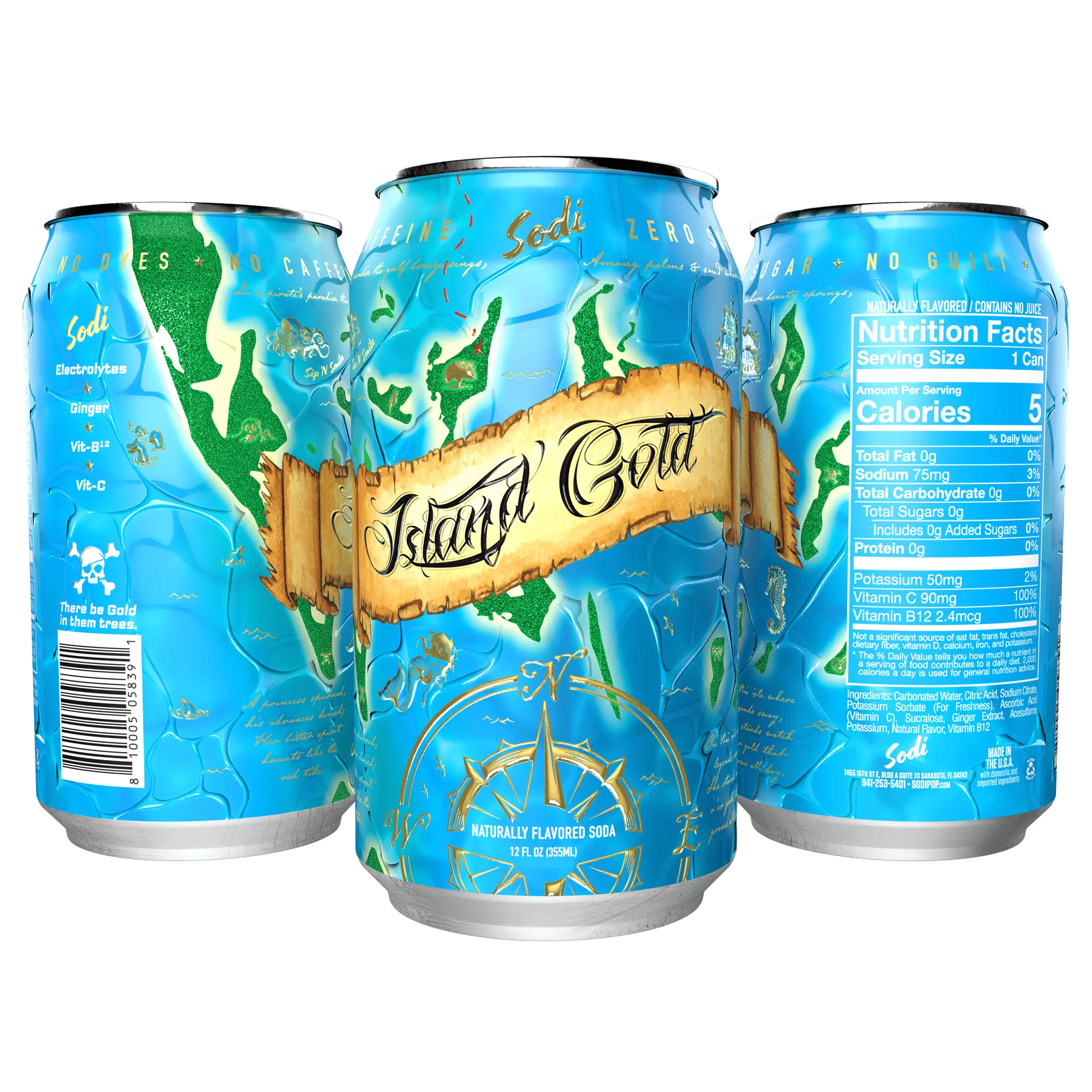 ·Sodi is the better-for-you soda that delivers amazing flavor and refreshment, with a little pop (pun intended) of nutrients so you can feel good about what you're sipping. Sodi contains better-for-you ingredients like Vitamin B12 and Vitamin C, but more important is what Sodi DOESN’T contain: high fructose corn syrup, artificial flavor or dyes, caffeine, and unnecessary fiber additives or other gut-wrenching ingredients. Sometimes, you just want a refreshing, delicious drink that you don’t have to overthink about.Each single flavor pack includes 12, 12oz. cans, the variety pack includes 2 cans of each flavor (12, 12oz. cans.) Beach Day: A sunrise on the beach is imbued with a different energy. Life begins as the sun breaks the horizon, shining on the waves, transforming the colors of the sky, as the sand absorbs its warmth. Being a part of this phenomenon fuels inspiration, hopefulness, and reminds us that today is a fresh start. For days you can't make it to the beach, open a can of Sodi and Vibe Higher. Stoked: There is an indescribable feeling when you catch the perfect wave. An undeniable synchronization between person and nature occurs, followed shortly by pure adrenaline and joy. Just as important as the thrill of the wave is having the courage to chase after it, and leave nothing behind when you find it. Sodi is about the chase; seeking the ultimate freedom and never shying away from it. Grab a can, and drop in.Corsa: Life comes at you fast, and doesn’t slow itself down. Revving through hairpin turns, staying on-track through chicanes and unexpected roadblocks, taking control often proves difficult. Corsa is the opportunity to put yourself in the driver's seat and set the pace. Crisp, clean flavors infused with life-enhancing ingredients put you on pace for the perfect podium finish. Island Gold: In a pirate’s paradise the gulf breeze sings,Among palms & sand where beauty springs,A princess spurned, his advances denied,Her bitter spirit haunts like the red tide,On this isle where legends sway,She stands watch o’er gold that grows all day. Pineapple|MK2: Pull the pin on a tired afternoon with the explosive tropical flavor of Pineapple MK2. This flavor is mission-ready to ration our signature electrolytes, vitamin C, and B12. Georgia: A sweet miracle that soaks in the sun, flourishing into a juicy & refreshing experience. Take a sip and get whisked away to an orchard at peak-season, feeling the sun on your skin with a can of Georgia.