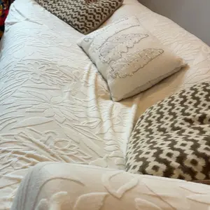 The material is soft and decorative. Unfortunately, it’s not a perfect fit for my 3 seater sofa. It fits to some point