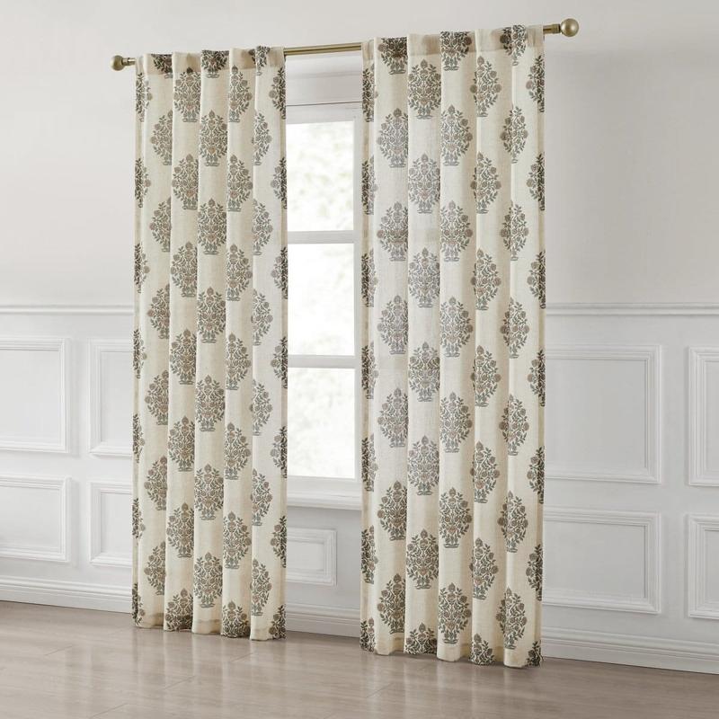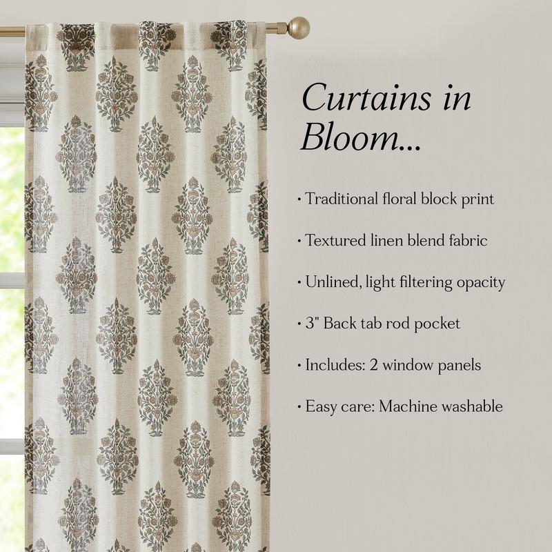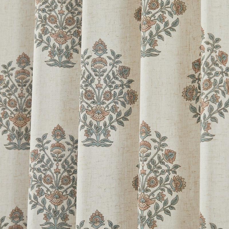 Add timeless charm to your windows with these floral curtains. Designed with a traditional block print in soft pastels, they blend boho and vintage styles effortlessly. Made with a textured linen blend, they offer moderate privacy and allow some light to pass through.