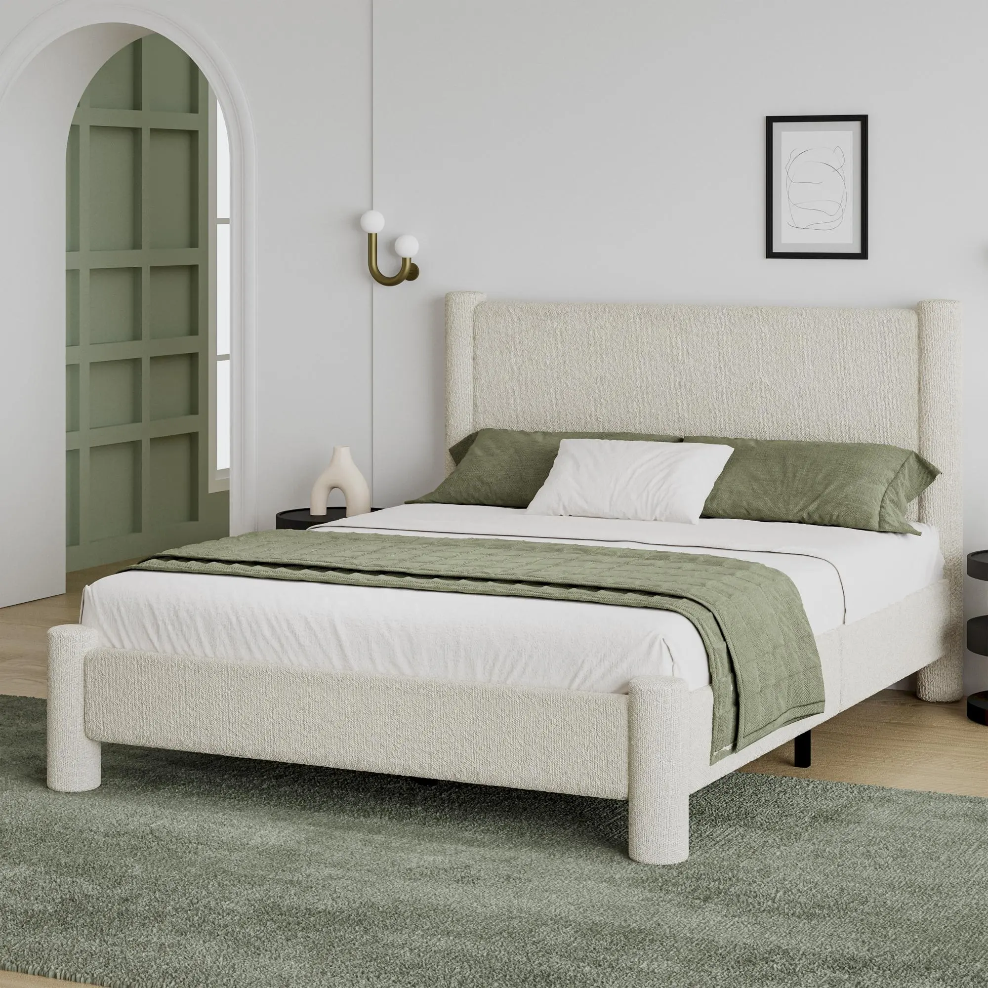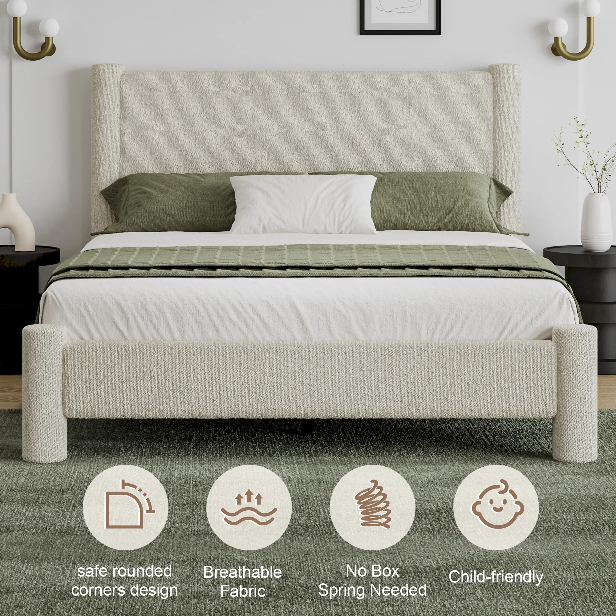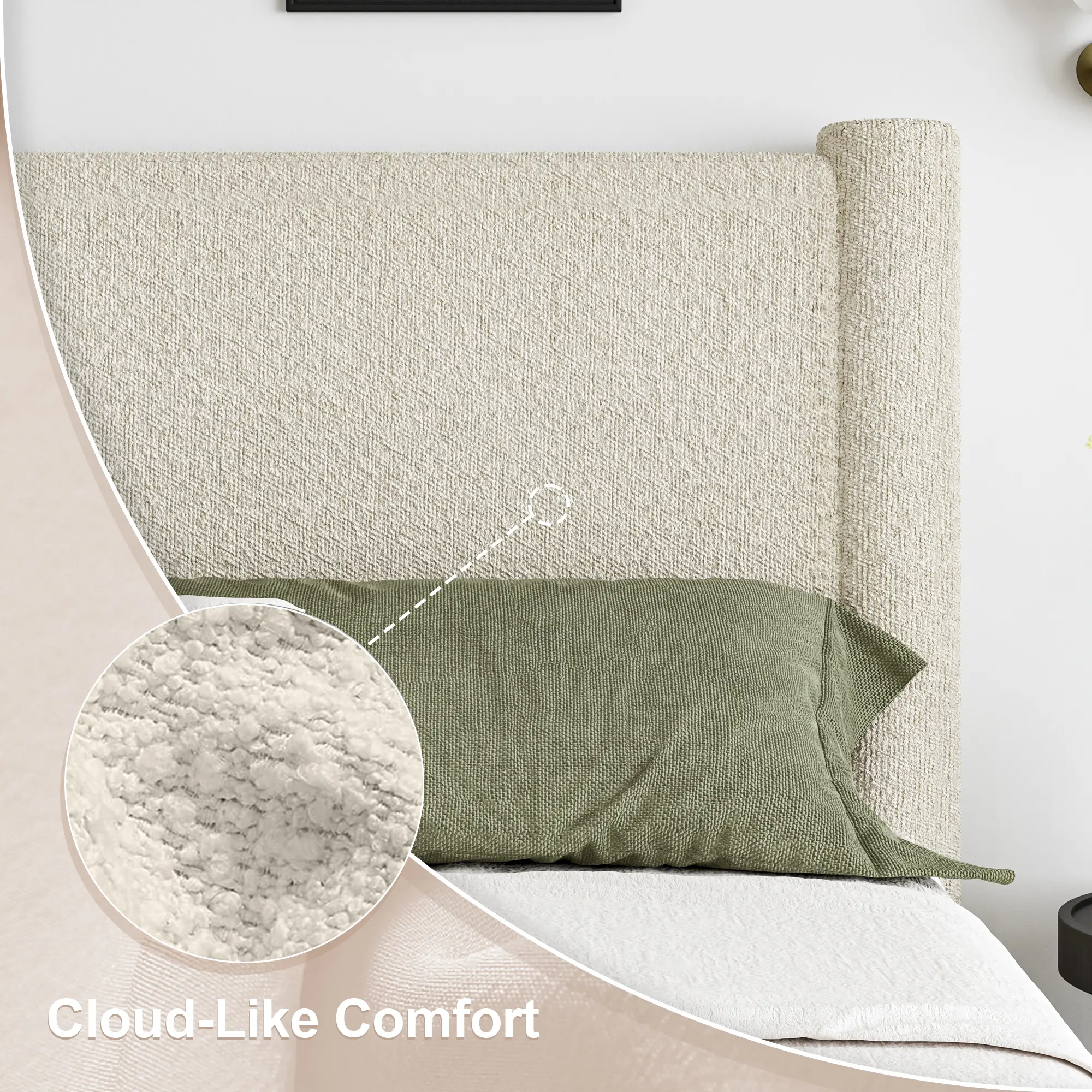 ·【Soft Bed Frame with Plush Boucle Fabric】:Experience cloud-like comfort with our "boucle upholstered bed frame". Thick padded edges and a cushioned headboard provide full-body softness, while the "wooden slat support system" ensures mattress stability and airflow