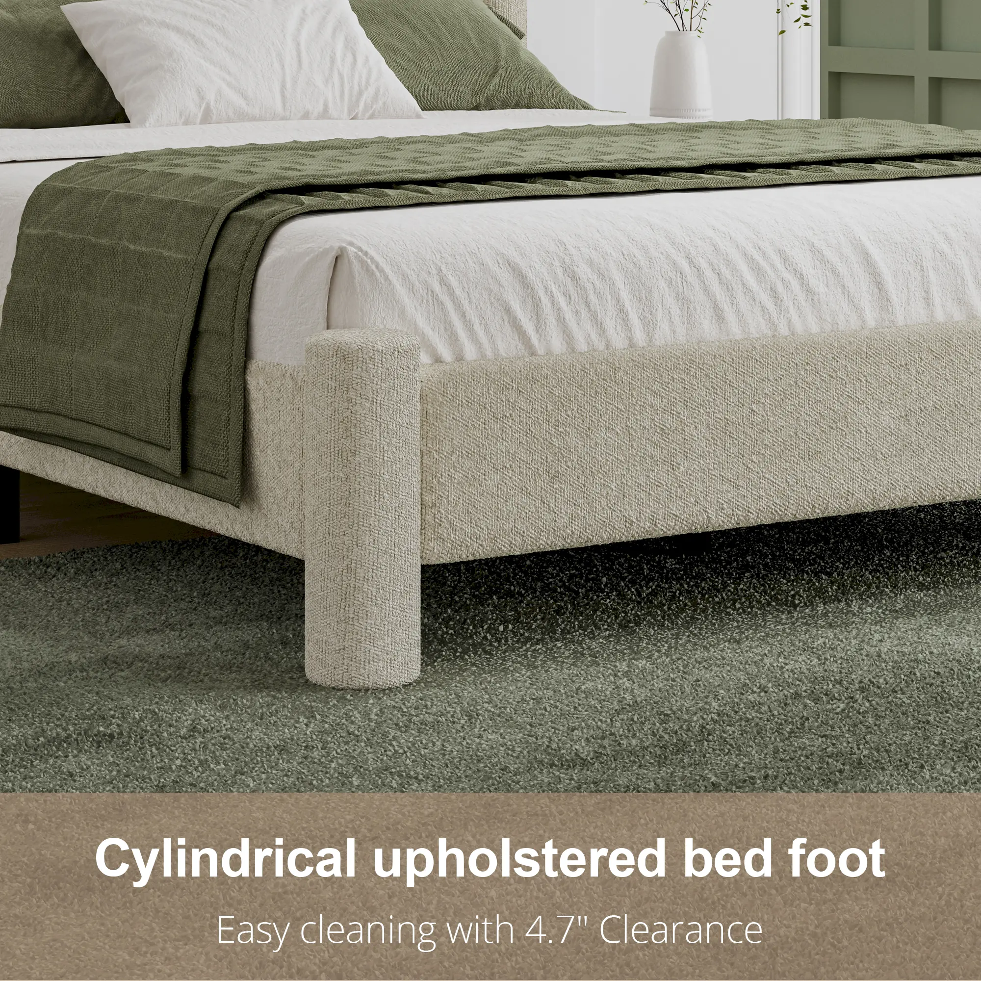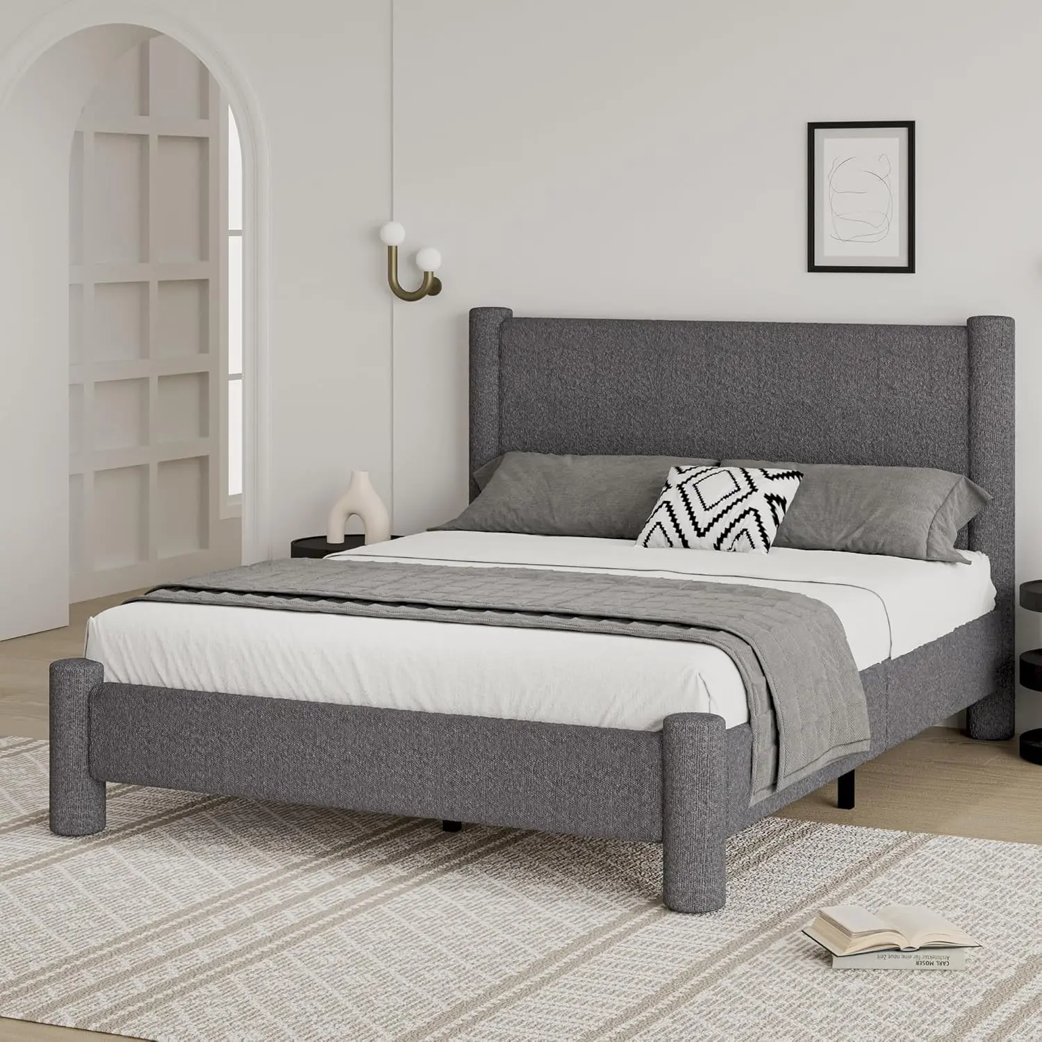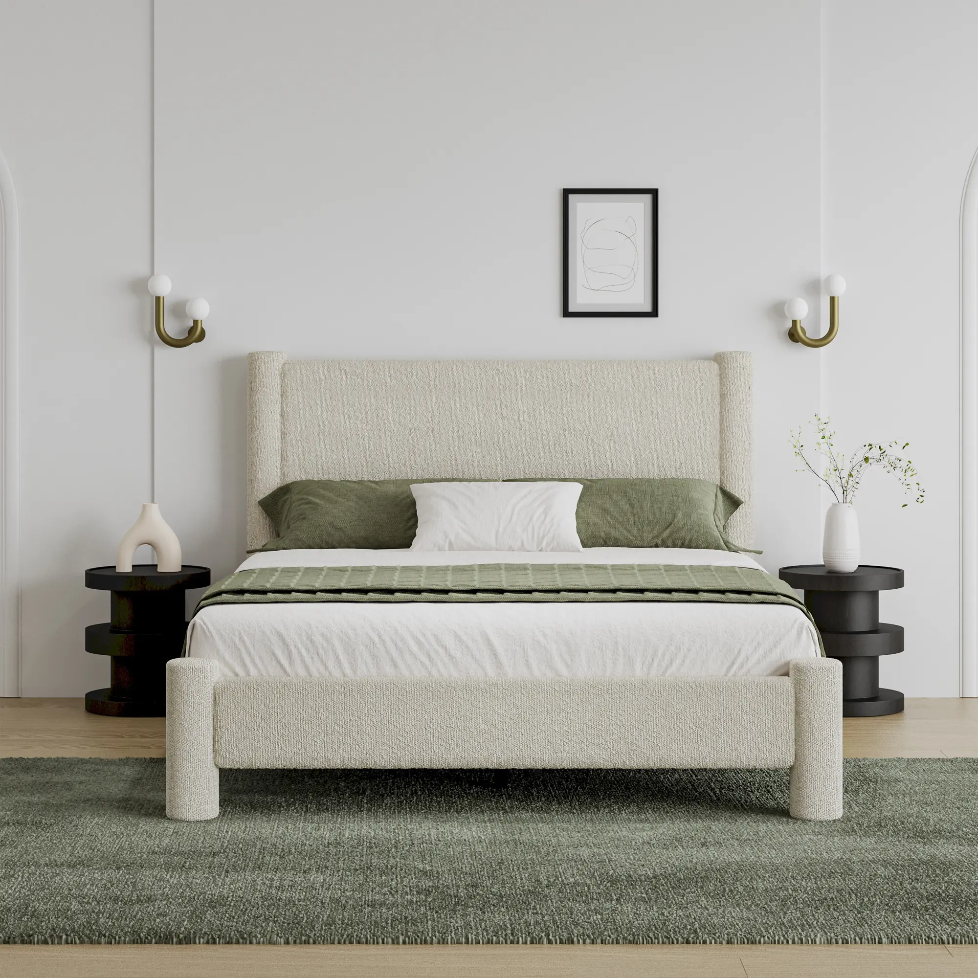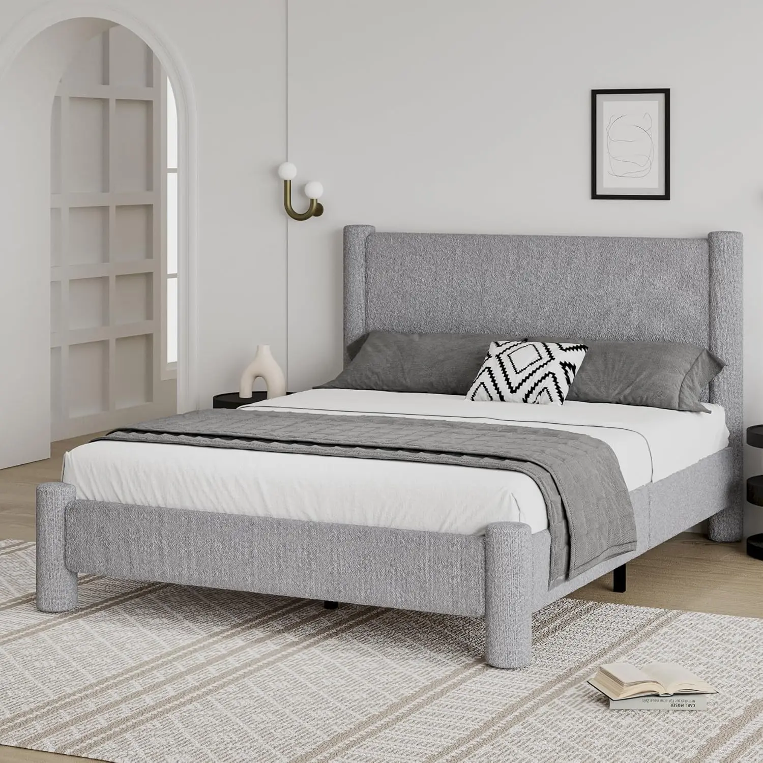·【Soft Bed Frame with Plush Boucle Fabric】:Experience cloud-like comfort with our "boucle upholstered bed frame". Thick padded edges and a cushioned headboard provide full-body softness, while the "wooden slat support system" ensures mattress stability and airflow