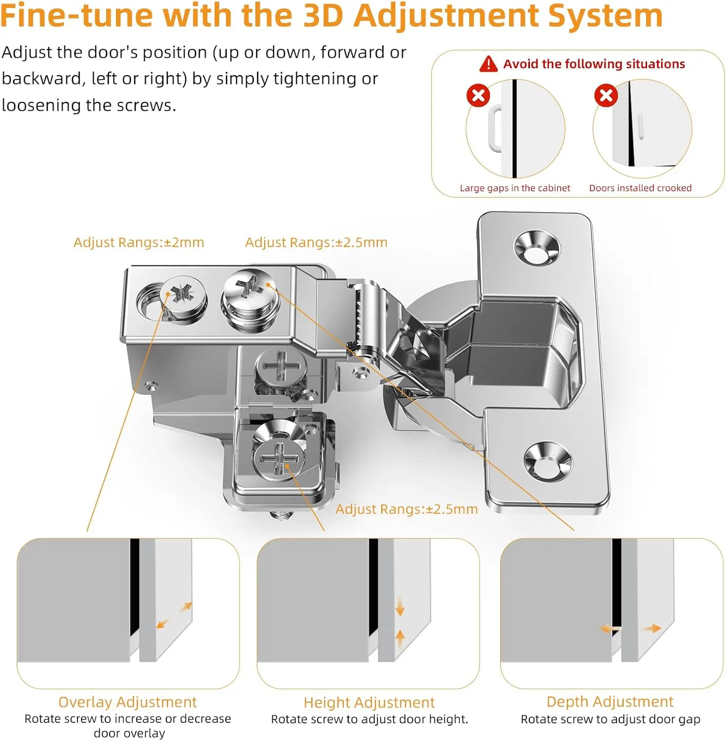 Enhanced 3-Way Adjustability: Experience the ultimate convenience with upgraded 3D adjustability feature. Adjust your cabinet doors left, right, , and forth with a simple turn of a . This ensures your cabinet doors are perfectly aligned, preventing sagging and guaranteeing smooth operation every time