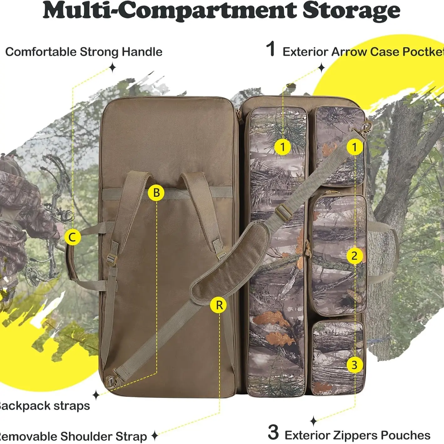 ăMulti-Compartment Storageă Compound bow case with layered compartments: main space for bow, deep arrow pockets, and pouches for accessories. Keeps gear organized for practice or hunting.