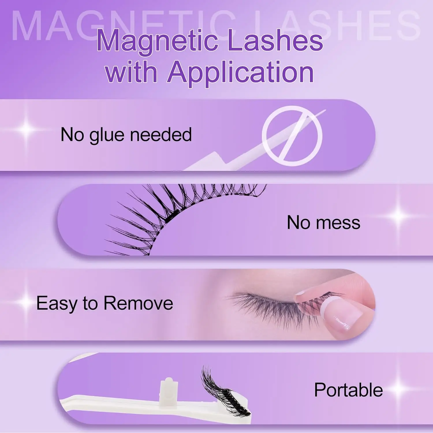 ·Separate Lashes: Gently rub the small magnets to split a pair of lashes into upper and lower pieces.
