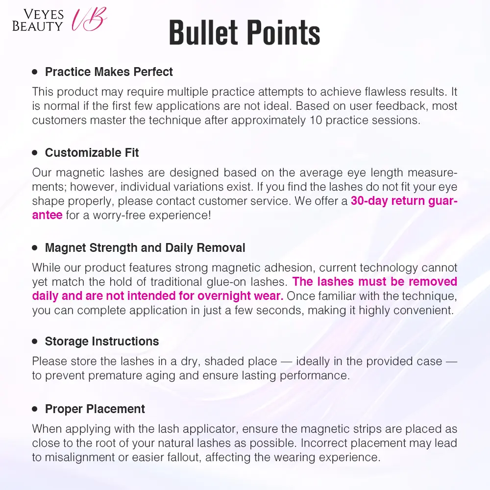 - When placing the lash pieces onto the applicator, carefully follow the instructions (refer to the provided images or videos). Incorrect placement may cause magnetic repulsion, making application impossible.