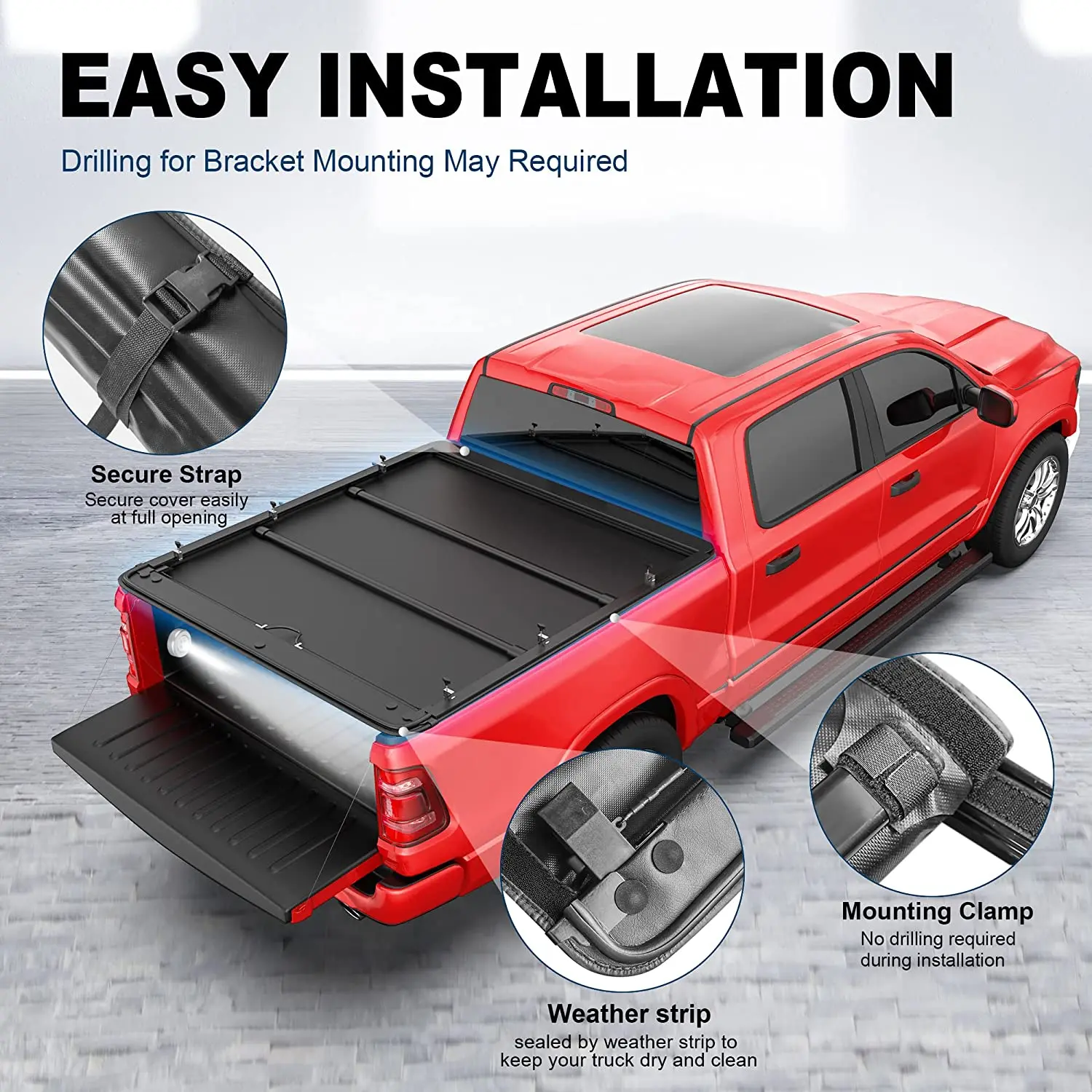 ·Quick Clamp for No-Drill Installation - Simple clamp-on rails and headers require no drilling or other special tools. You can easily secure the side rails to the truck bed.