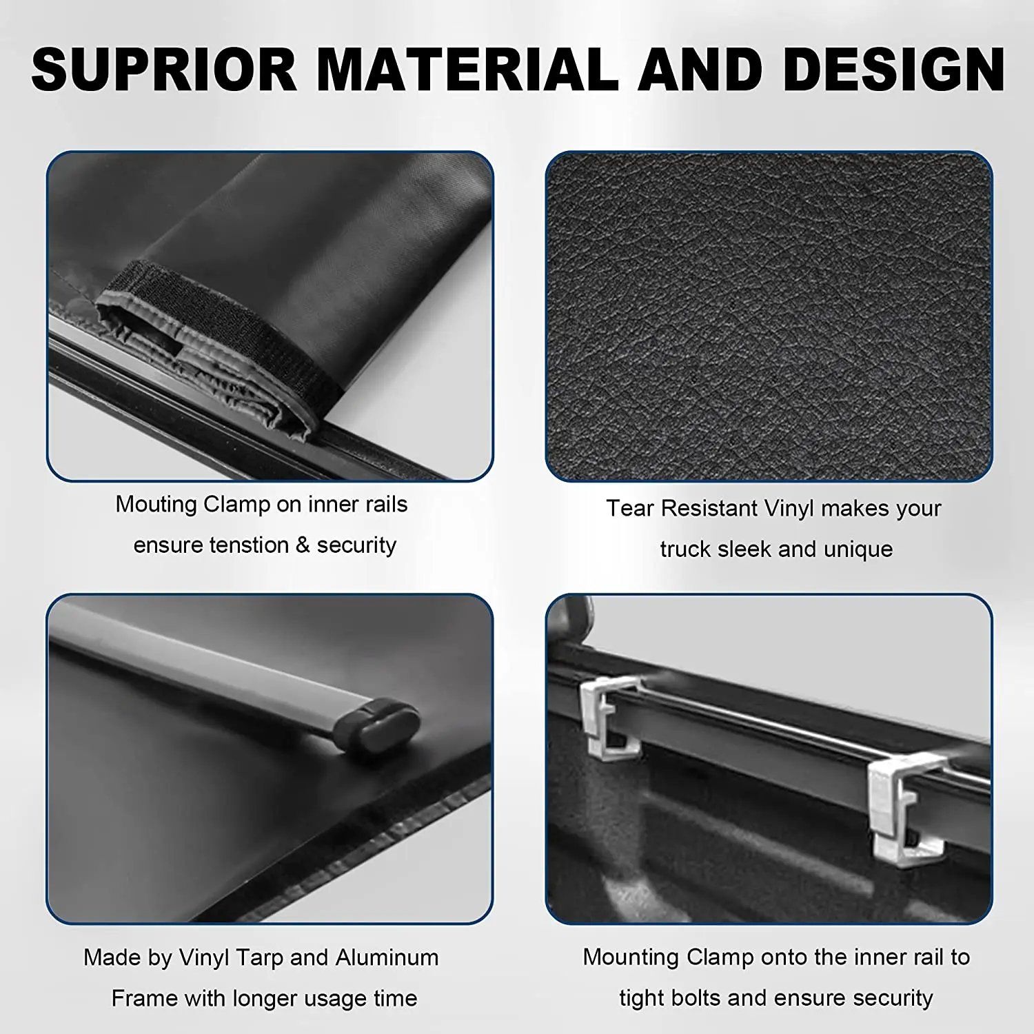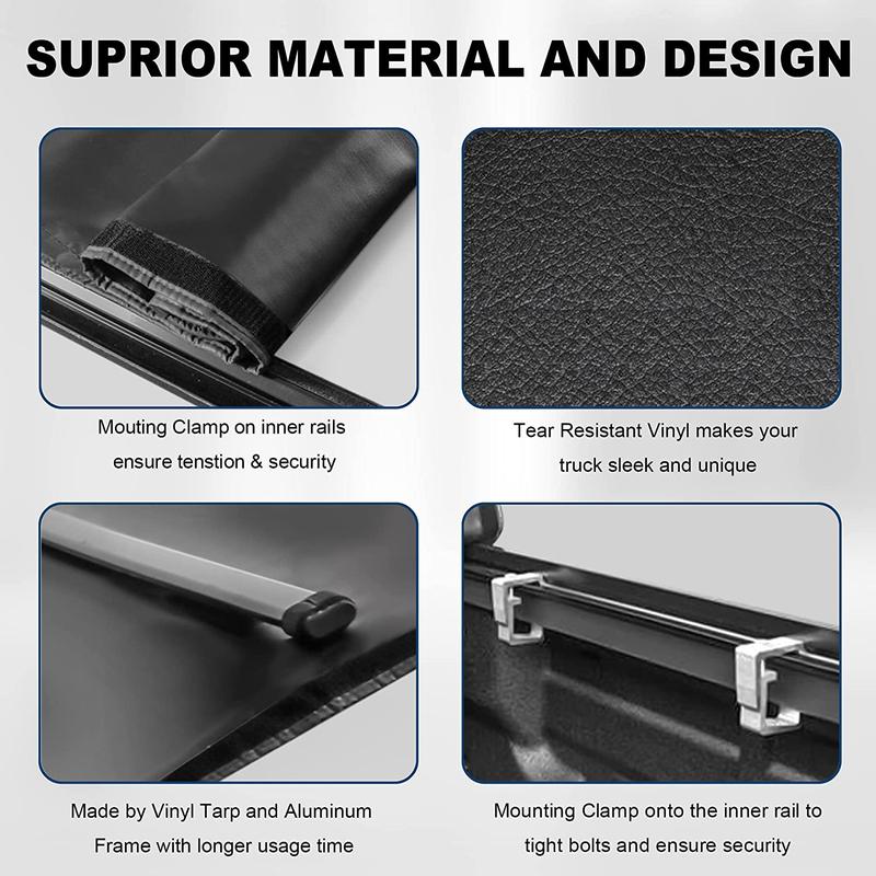 ·Waterproof & UV Resistant - The tensioned vinyl cloth keeps the cover flat and not prone to water accumulation. This tonneau cover can be washed with soap and water.