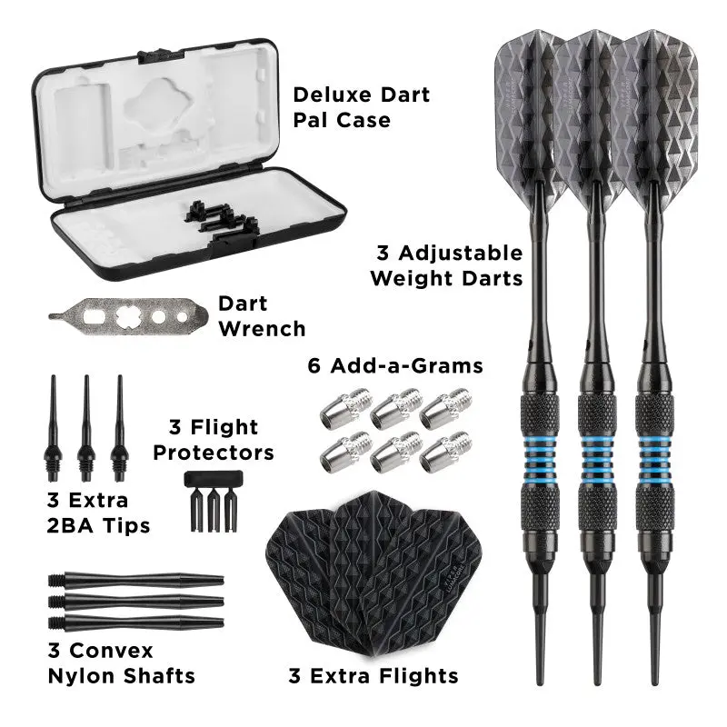·Included - Dart wrench, 6 add-a-grams, three extra 2BA tips, three flight protectors, three nylon shafts, three extra flights, and a deluxe dart pal case