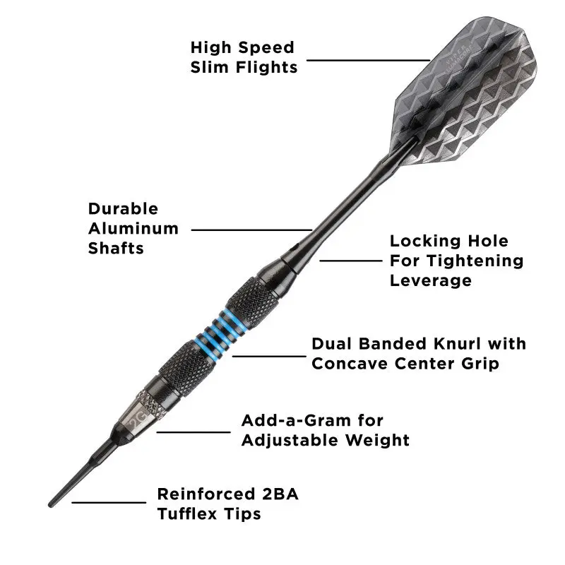 Experiment with new weights with the Viper Bobcat Adjustable Soft Tip Darts. These unique darts use an adjustable add-a-gram system so their weight can be adjusted between 16, 17, or 18 grams. When playing without a weight on, these darts will weigh 16 grams and use 1/4” dart tips (not included). Depending on the add-a-gram set you use, the darts will weigh either 17 or 18 grams and use 2BA dart tips. This soft tip dart set comes with three fully assembled darts, a dart wrench, 6 add-a-grams, three extra 2BA tips, three flight protectors, three nylon shafts, three extra flights, and a deluxe dart pal case that can hold everything included.