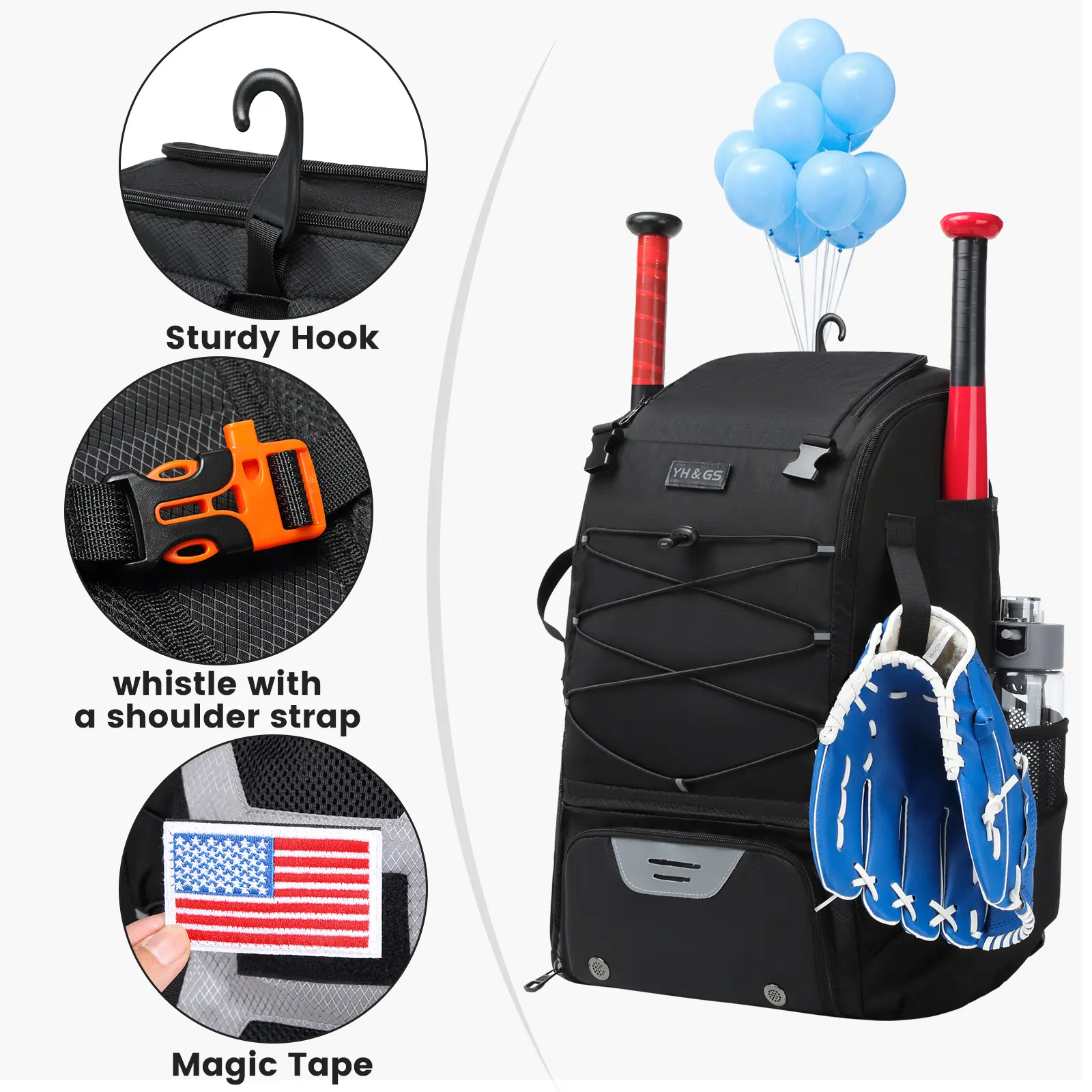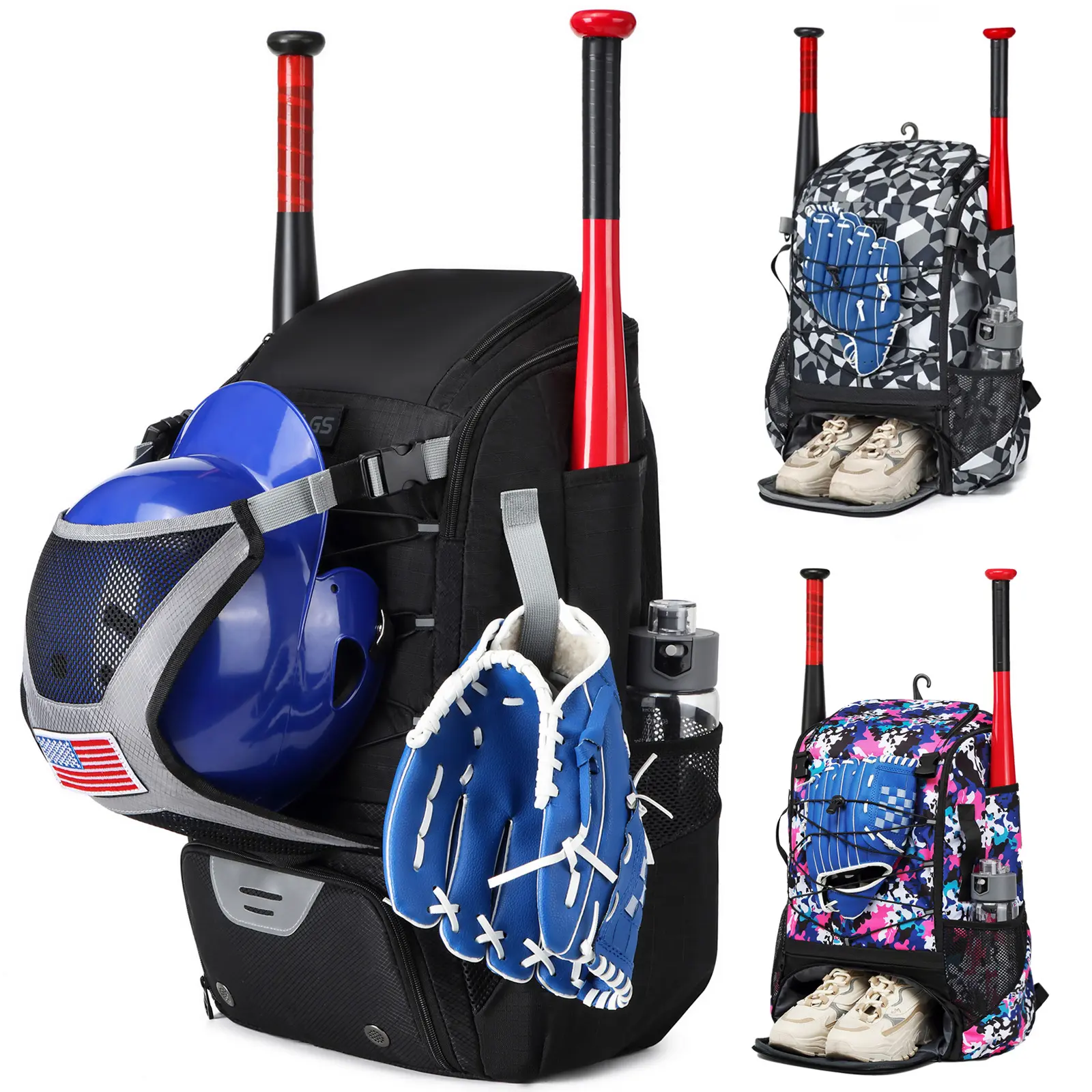 ·A hidden zipper pocket at the bottom with a net for batting helmets.