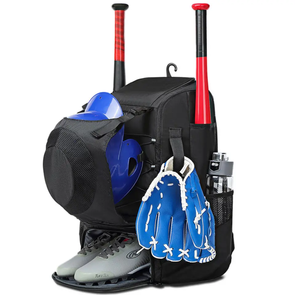 This lightweight bat backpack is perfect for baseball and softball enthusiasts. It features a large main compartment for helmets, batting mittens, shoes, and teeballs. The dimensions are 21*14*9 inches, with a capacity of 29L. It includes one front zippered pocket and a separate shoe compartment. The bag is ideal for exercise, training, indoor and outdoor sports, hiking, and more.