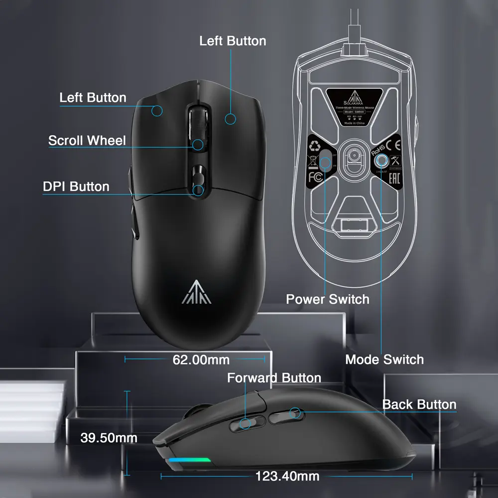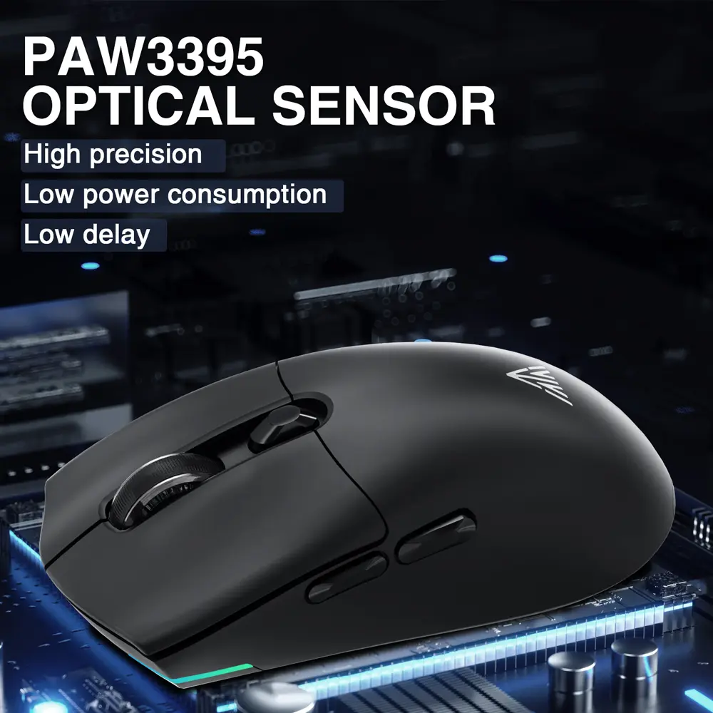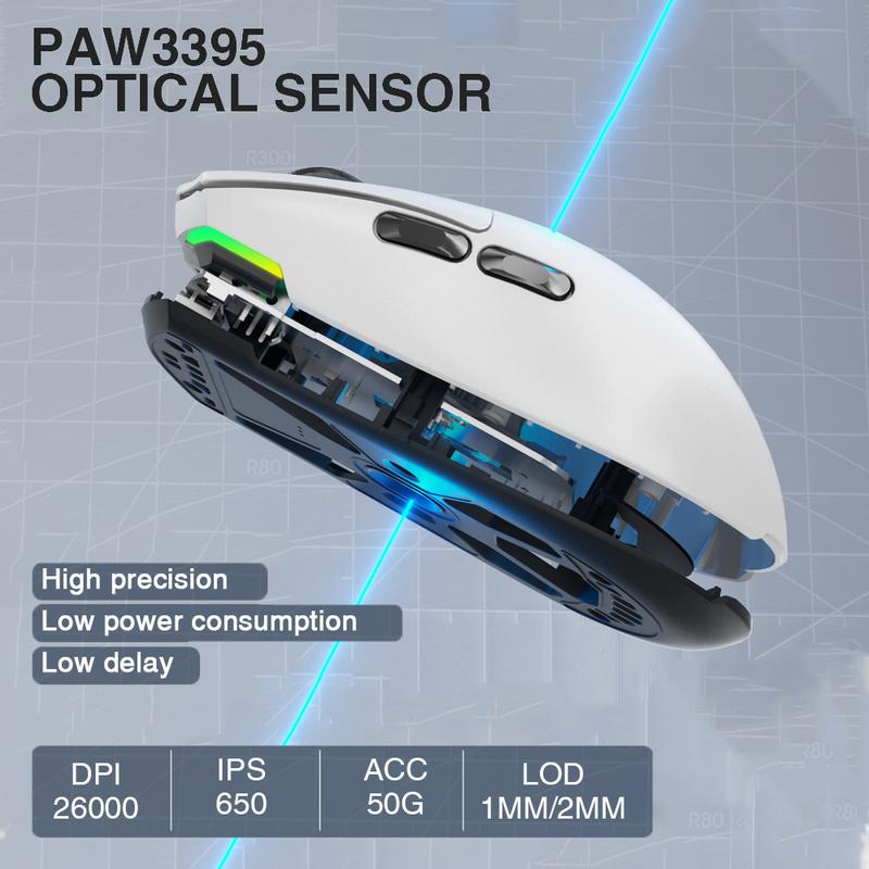 ·PAW3395 Optical Sensor:SM800 is a powerful gaming mouse with excellent performanc,equipped with PAW3395 sensor that is one of the most advanced optical sensors on the market,it has the advantages of high precision,low power consumption,low latency.SM800 supports 6 levels adjustable DPI up to 26,000,user's can setup different DPI according needs,it suitable for games, office and many occasions