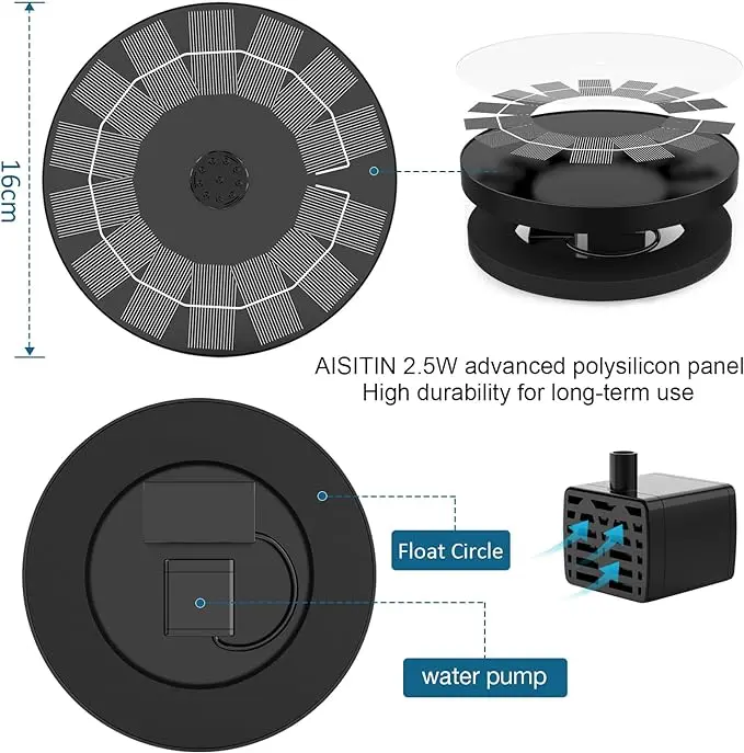 ·[Efficient Solar Panel]: AISITIN 2.5W Solar bird bath fountain is powered by solar energy. High-efficiency solar panels work immediately when placed in the sun. The more sunlight, the better the effect, and the fountain will bring you unexpected beauty.