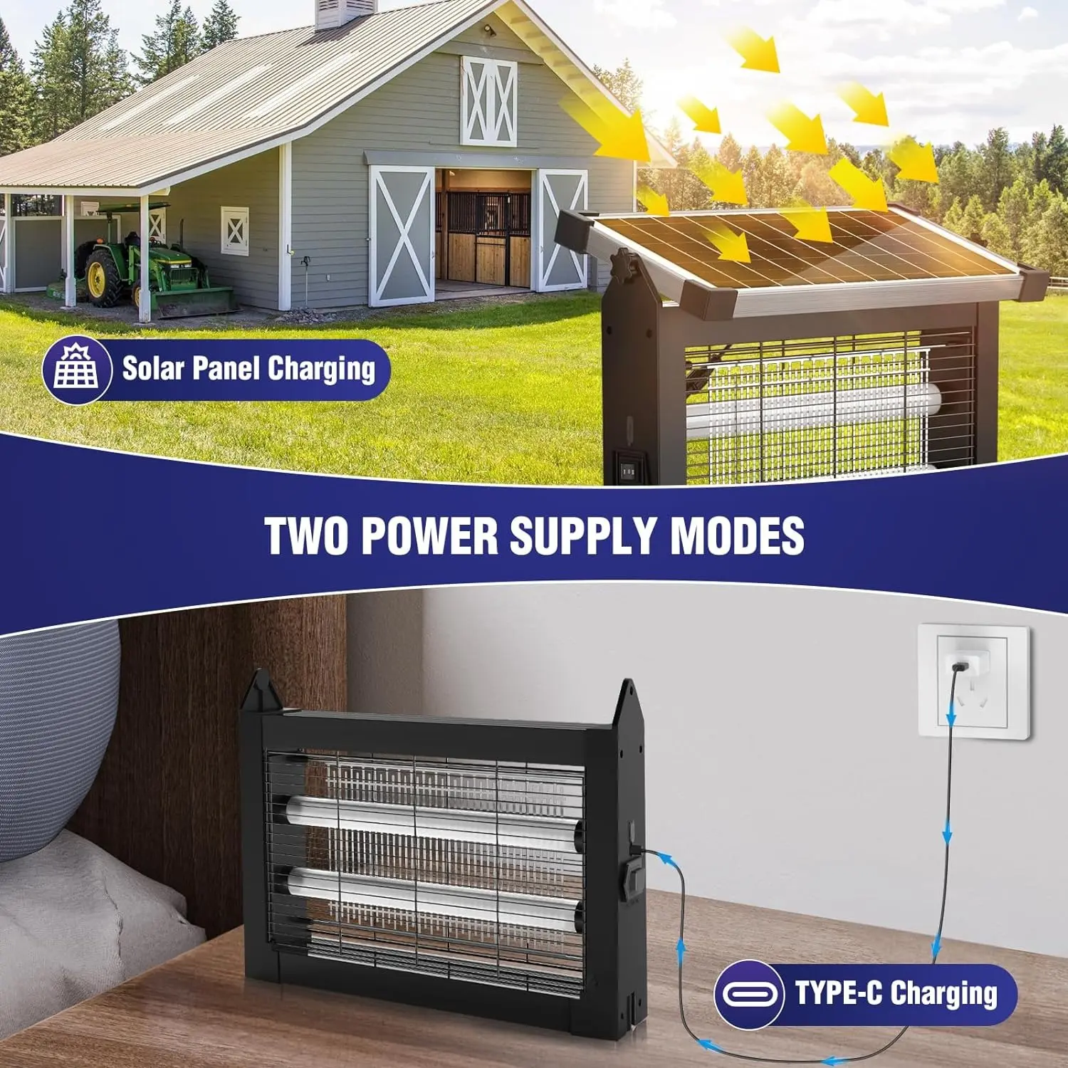 ·Diverse Power Supply Options: The solar bug zapper outdoor is designed with three effective power supply methods: a 10 W 5V solar panel, a Type-C cable, and a rechargeable battery. The fly zapper's battery charges in 4-6 hours, with an indicator changing from red to green when fully charged.A single charge can last about 12 hours. Outdoor bug zapper features an adjustable solar panel for optimal light exposure. When using outdoors, cover the charging and switch ports to waterproof the device.