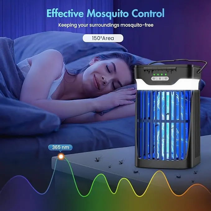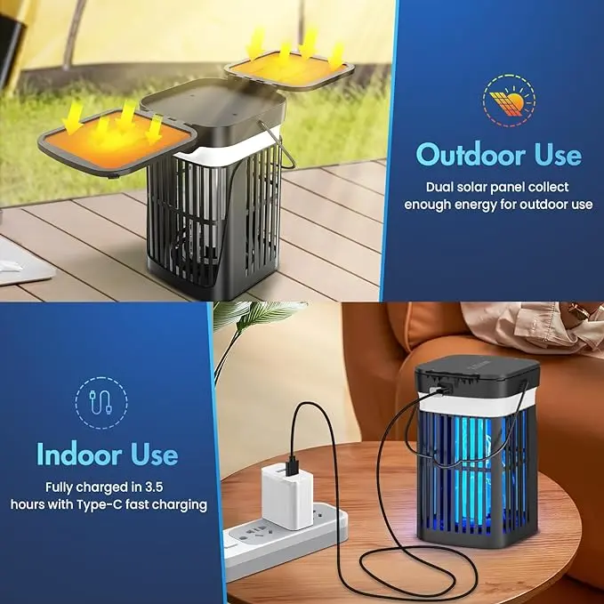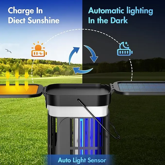 ·Solar Bug Zapper Update:The solar mosquito zapper is designed for both indoor and outdoor use.It charges in sunlight and operates automatically-shutting off during the day and turning back on at night.Equipped with dual-sided fold able solar panels,it helps eliminate mosquitoes and other flying insects.For optimal results,it is advisable to minimize surrounding light during its operation.