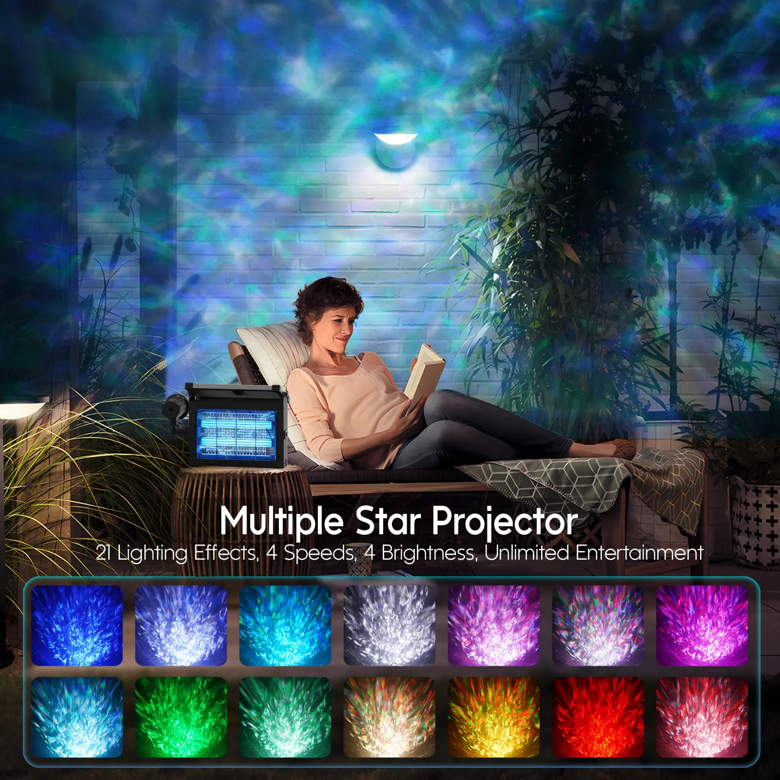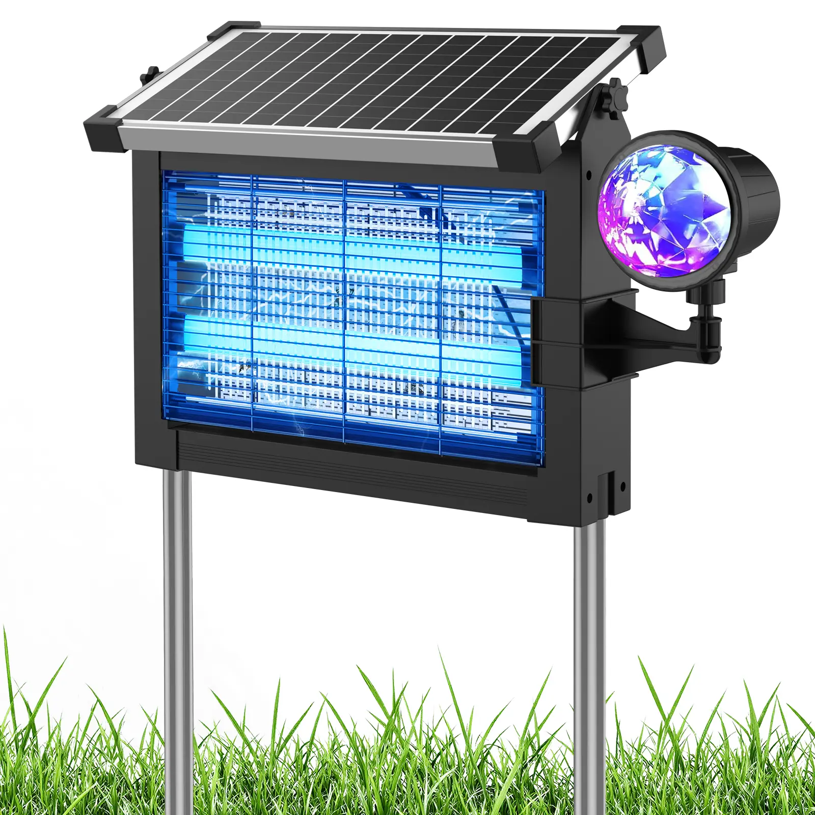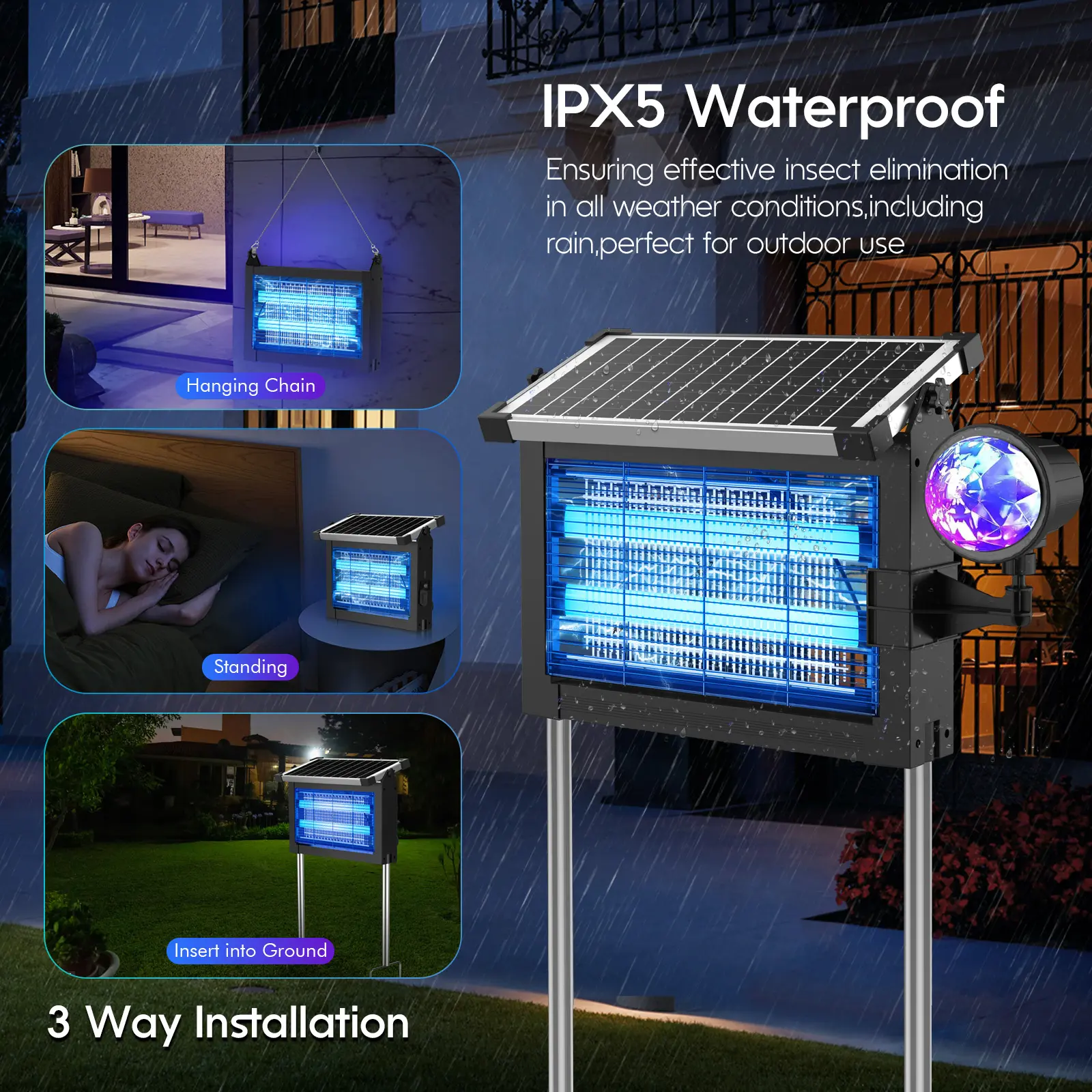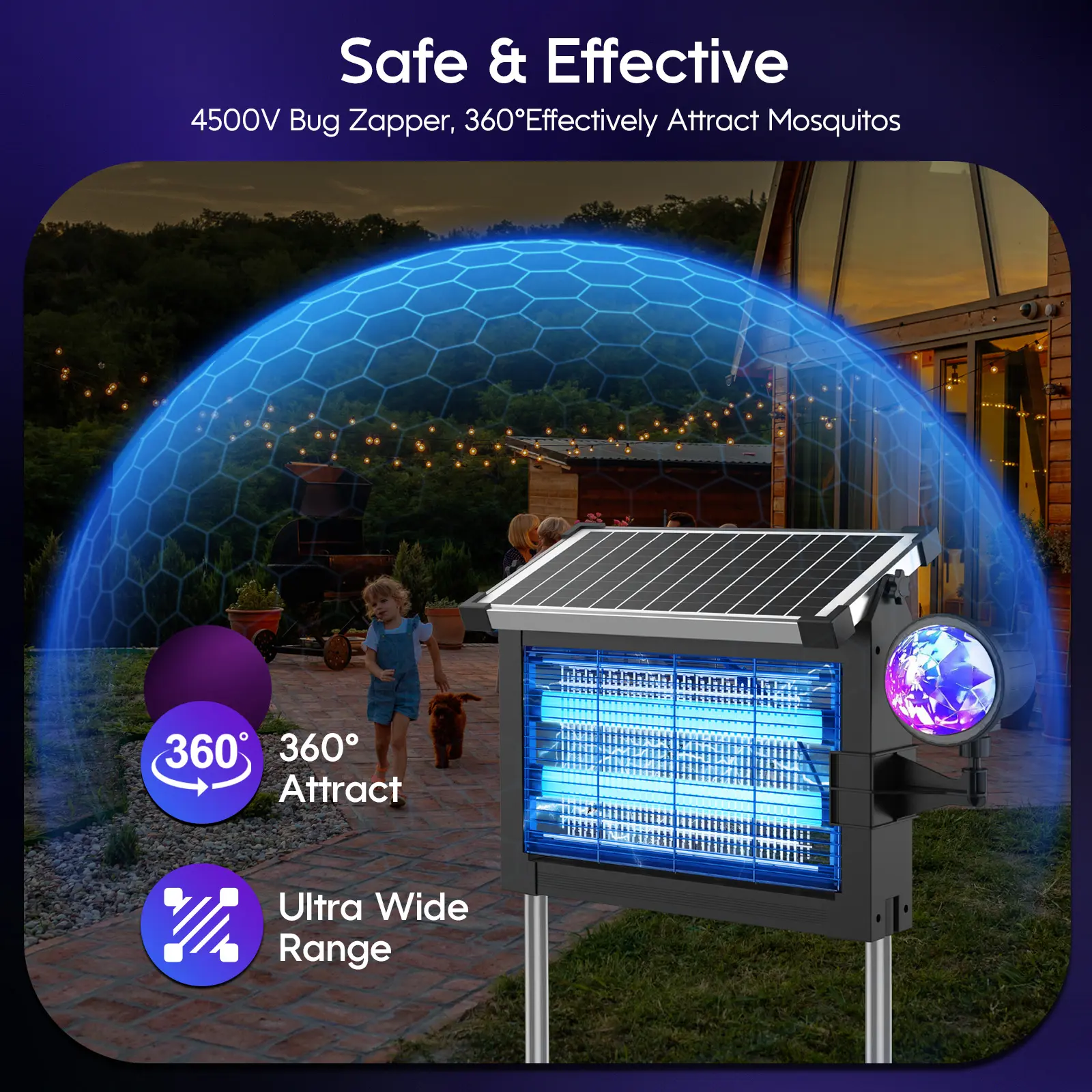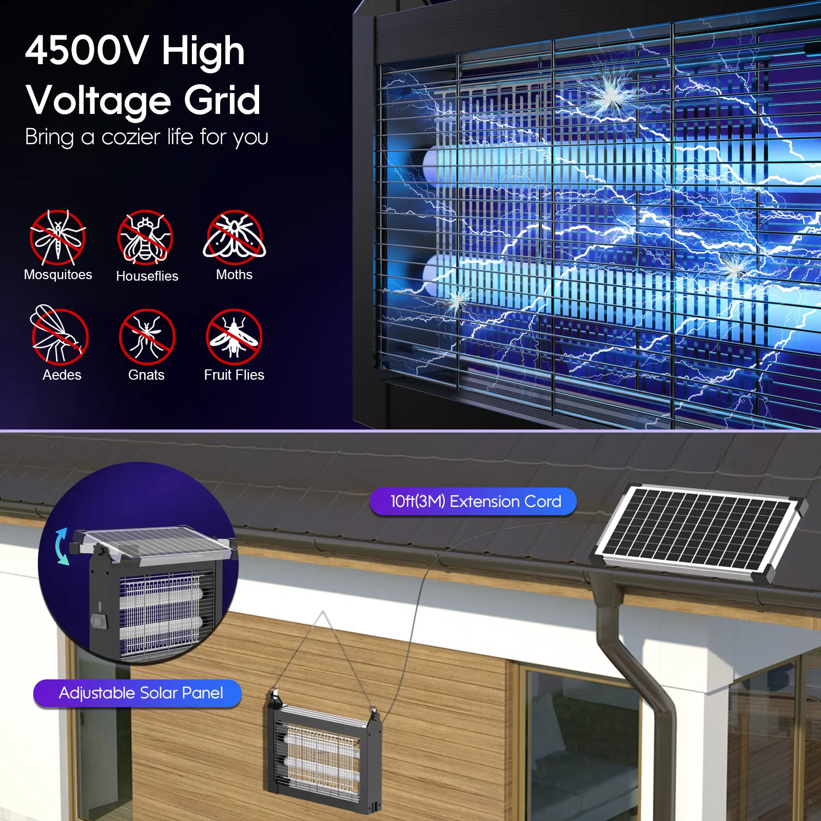·High-Efficiency Wide-Area Pest Control: Upgraded outdoor solar insect killer features 2 high-efficiency LED bulbs (wavelength 365-395nm) to attract and eliminate mosquitoes, gnats, moths, flies, wasps, and other flying insects. Equipped with a 4500V powerful electric grid that instantly eliminates pests. Perfectly safeguards your home, garden, patio, and outdoor spaces from pesky insect invasions.