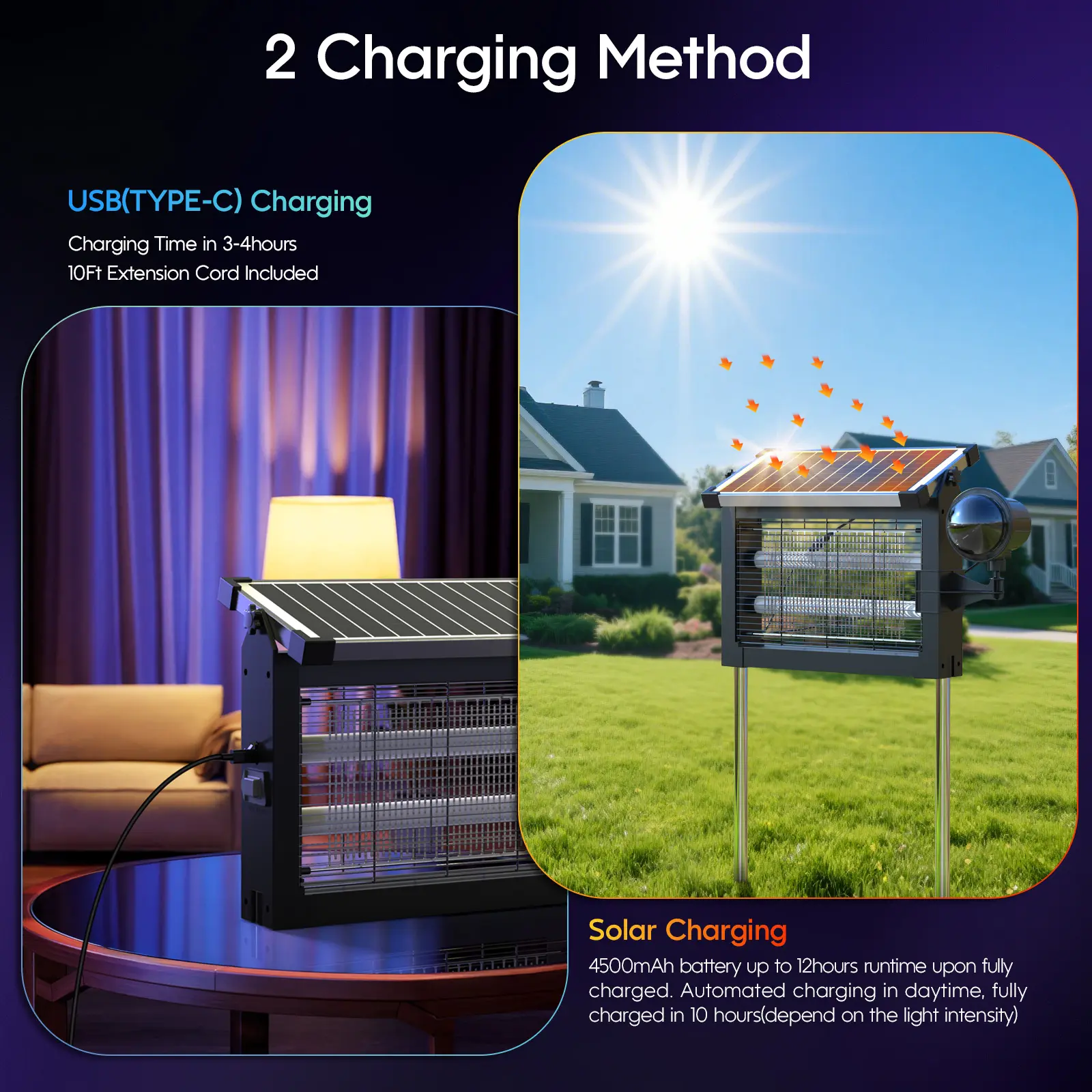 Ā·Dual Charging Modes: Solar + USB Power: Features a 10W 5V monocrystalline solar panel and a 4000mAh rechargeable battery for eco-friendly, energy-efficient operation. Achieve sustainable use through direct sunlight exposure, or use the included 1.2-meter USB-C cable for rapid chargingāfully charged in just 3-4 hours. Delivers up to 12 hours of continuous protection on a full charge. Suitable for