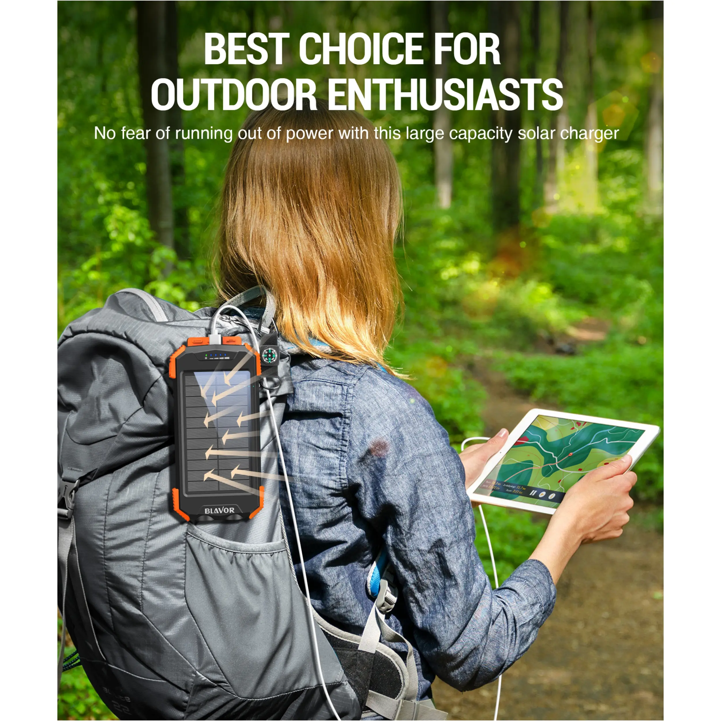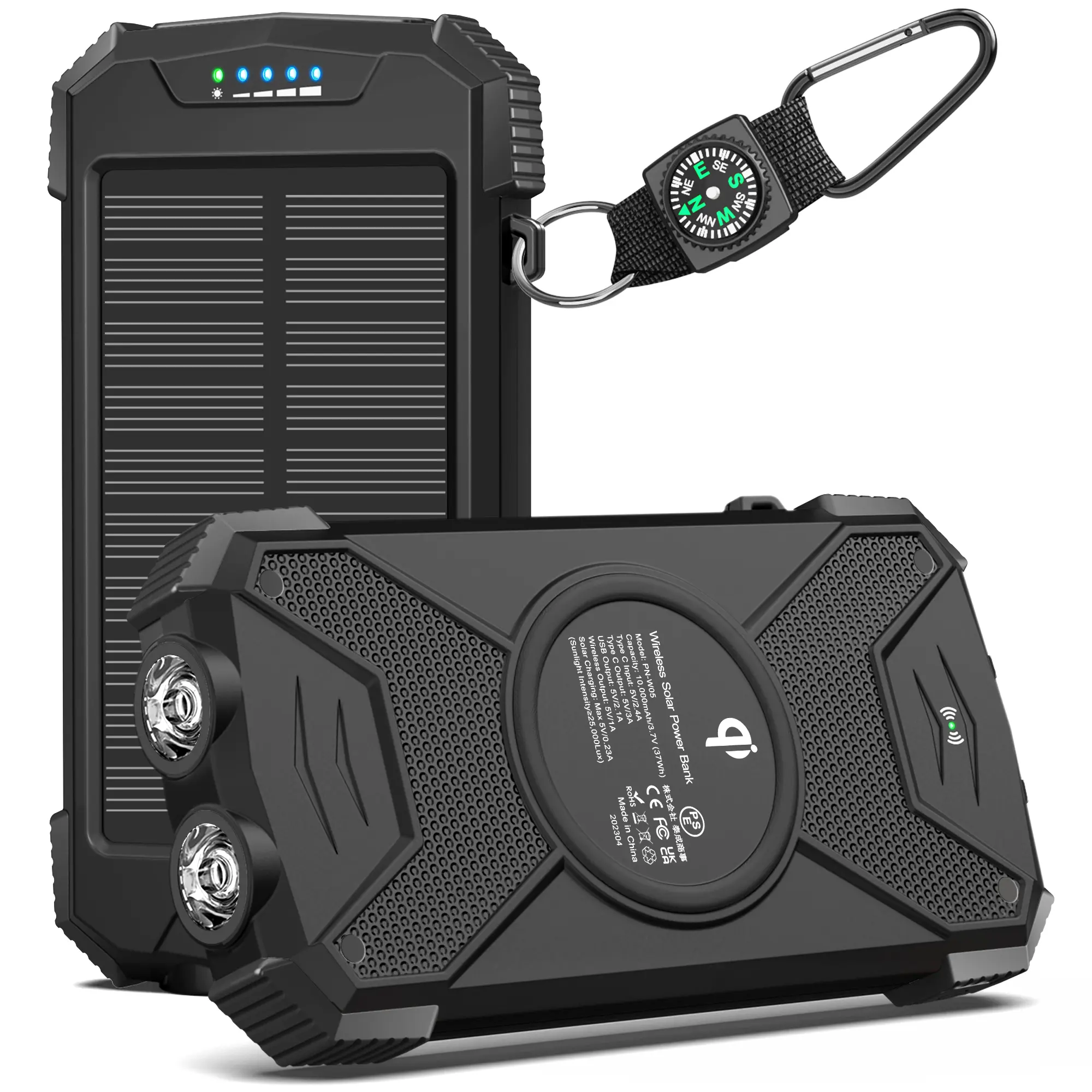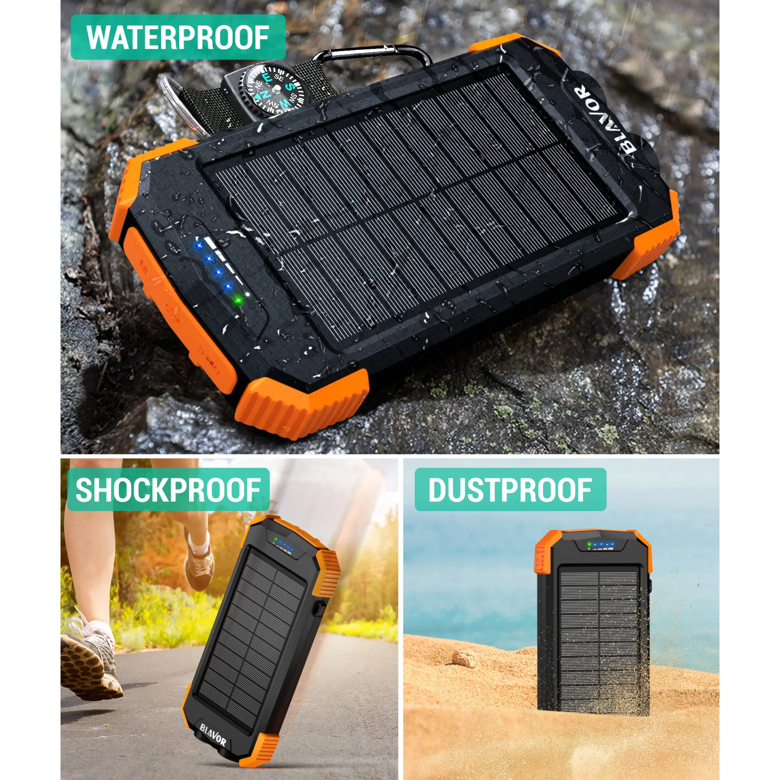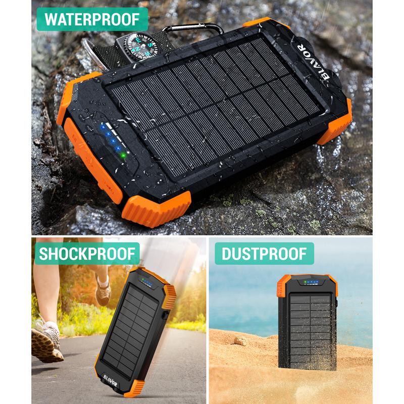 This portable solar charger is made to be IPX5 waterproof, dustproof and shockproof. The built-in dual super bright flashlights and the included compass carabiner can further ensure your safety when traveling outdoors, making it an ideal companion for outdoor enthusiasts.