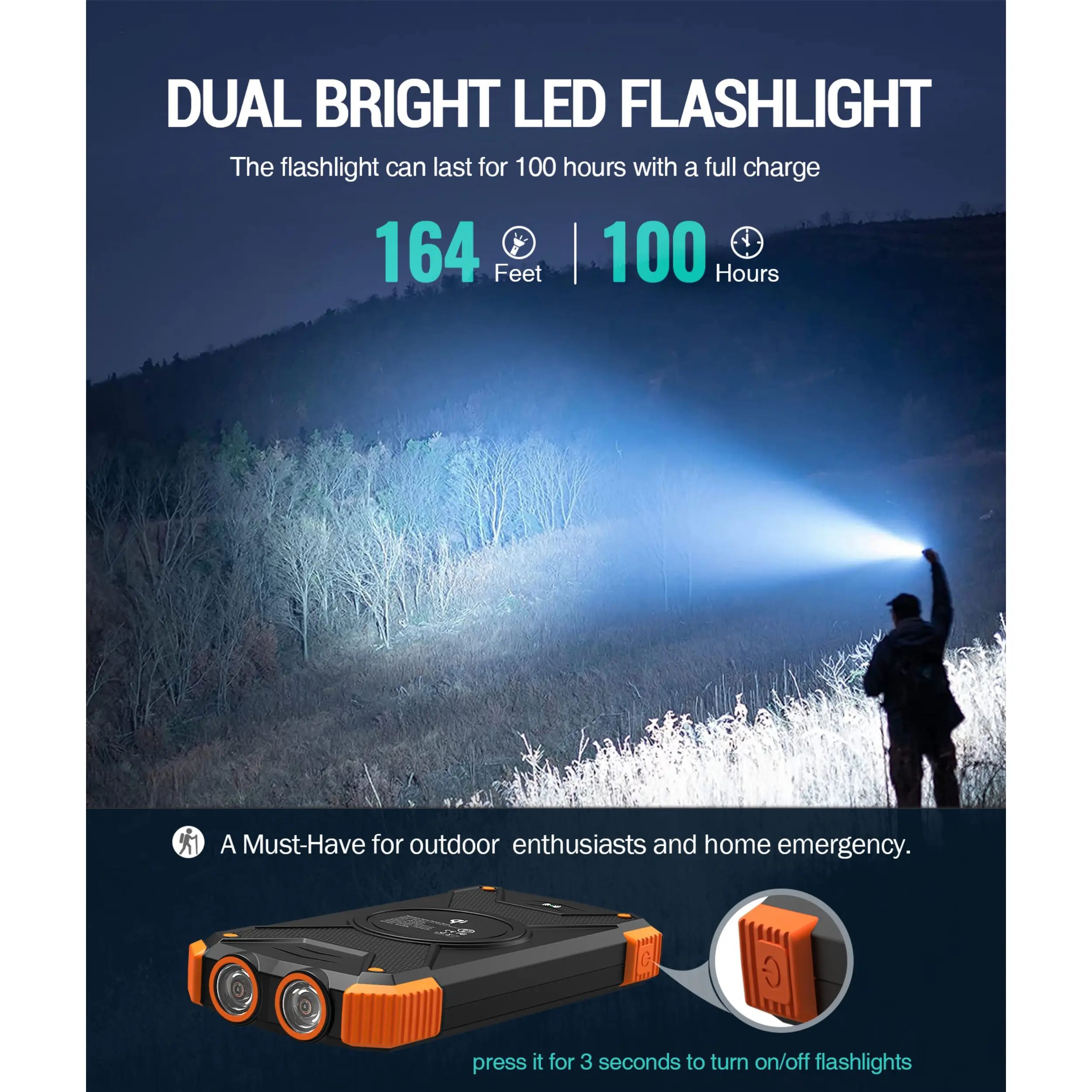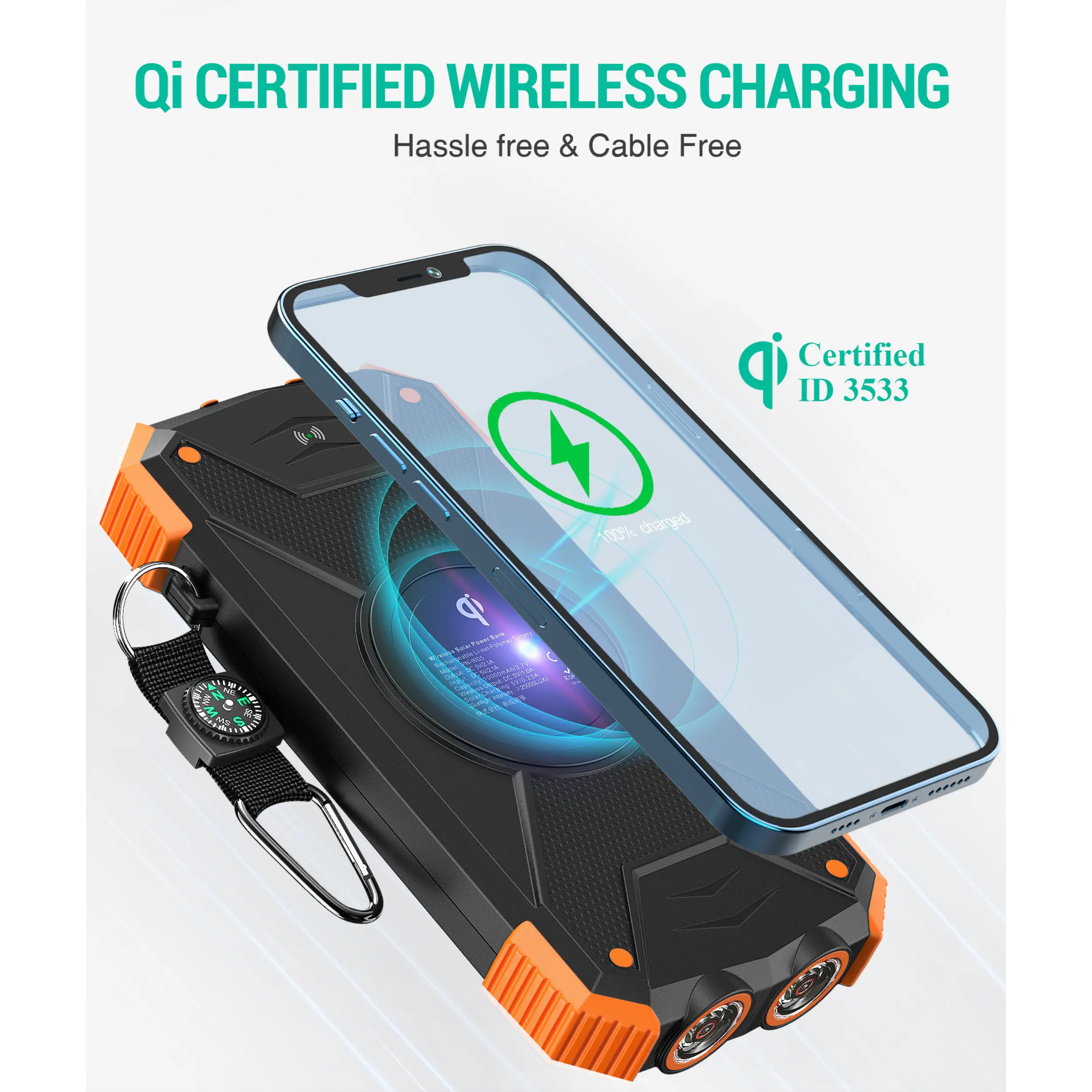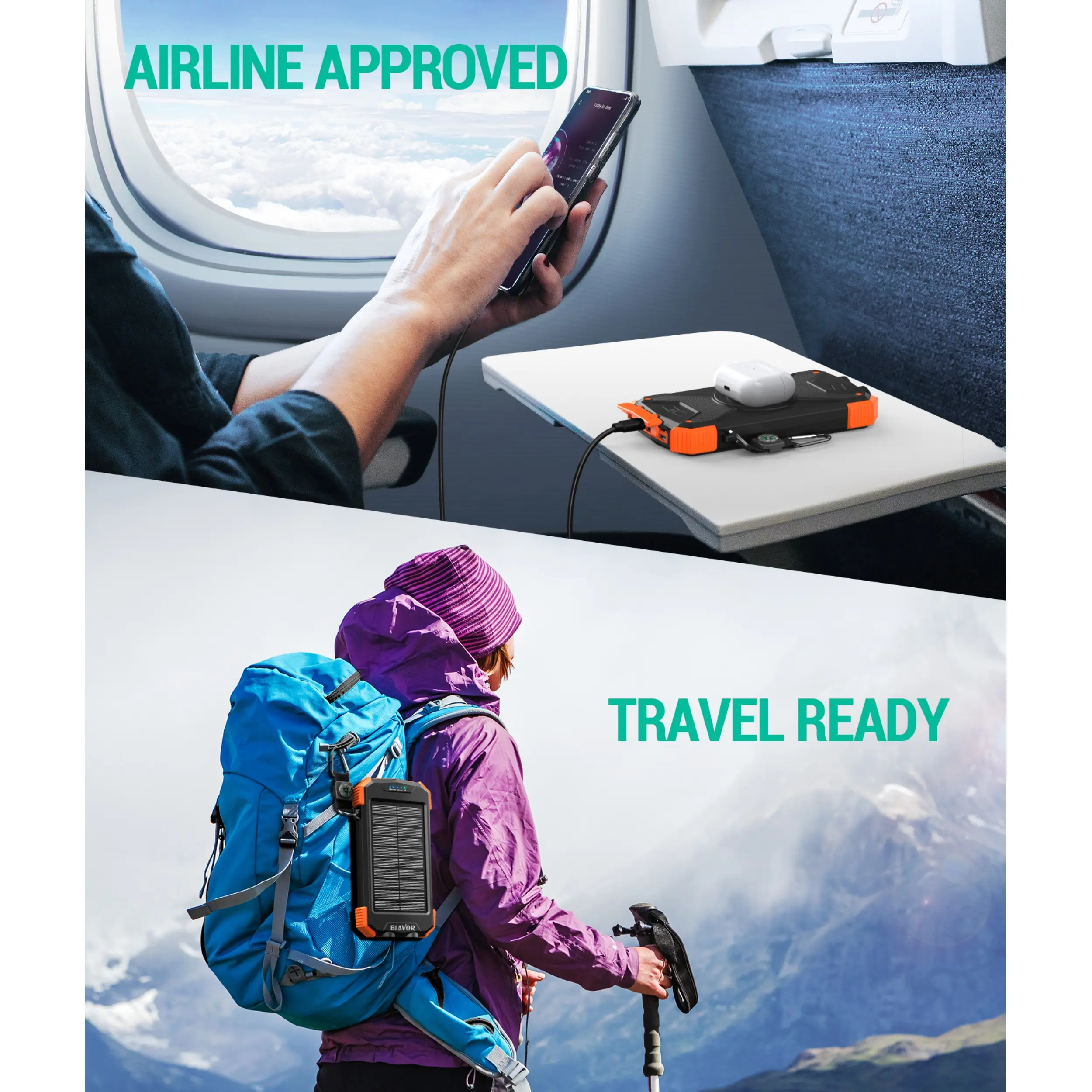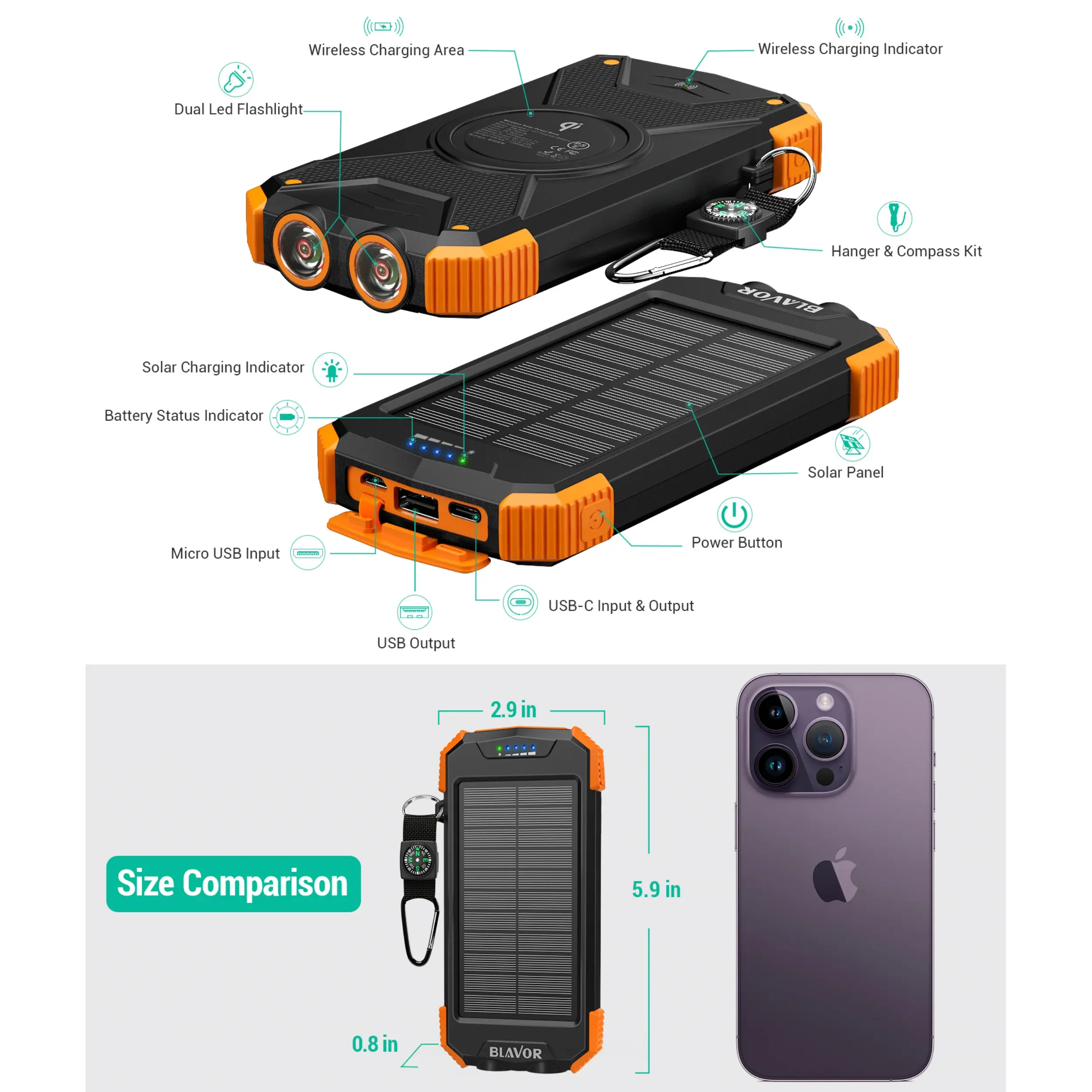 This portable solar charger is made to be IPX5 waterproof, dustproof and shockproof. The built-in dual super bright flashlights and the included compass carabiner can further ensure your safety when traveling outdoors, making it an ideal companion for outdoor enthusiasts.