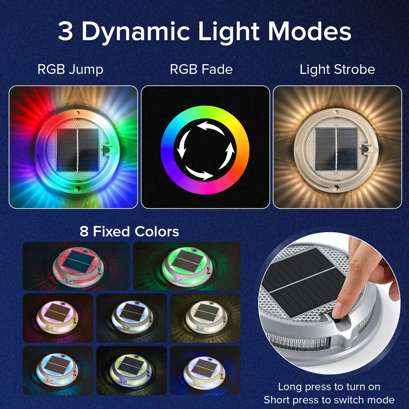 Upgraded 2025 solar driveway lights with RGB colors and 3 dynamic lighting modes. DIY your own color combinations to light up driveways, garden paths, decks, and patios with vibrant, eye-catching effects.