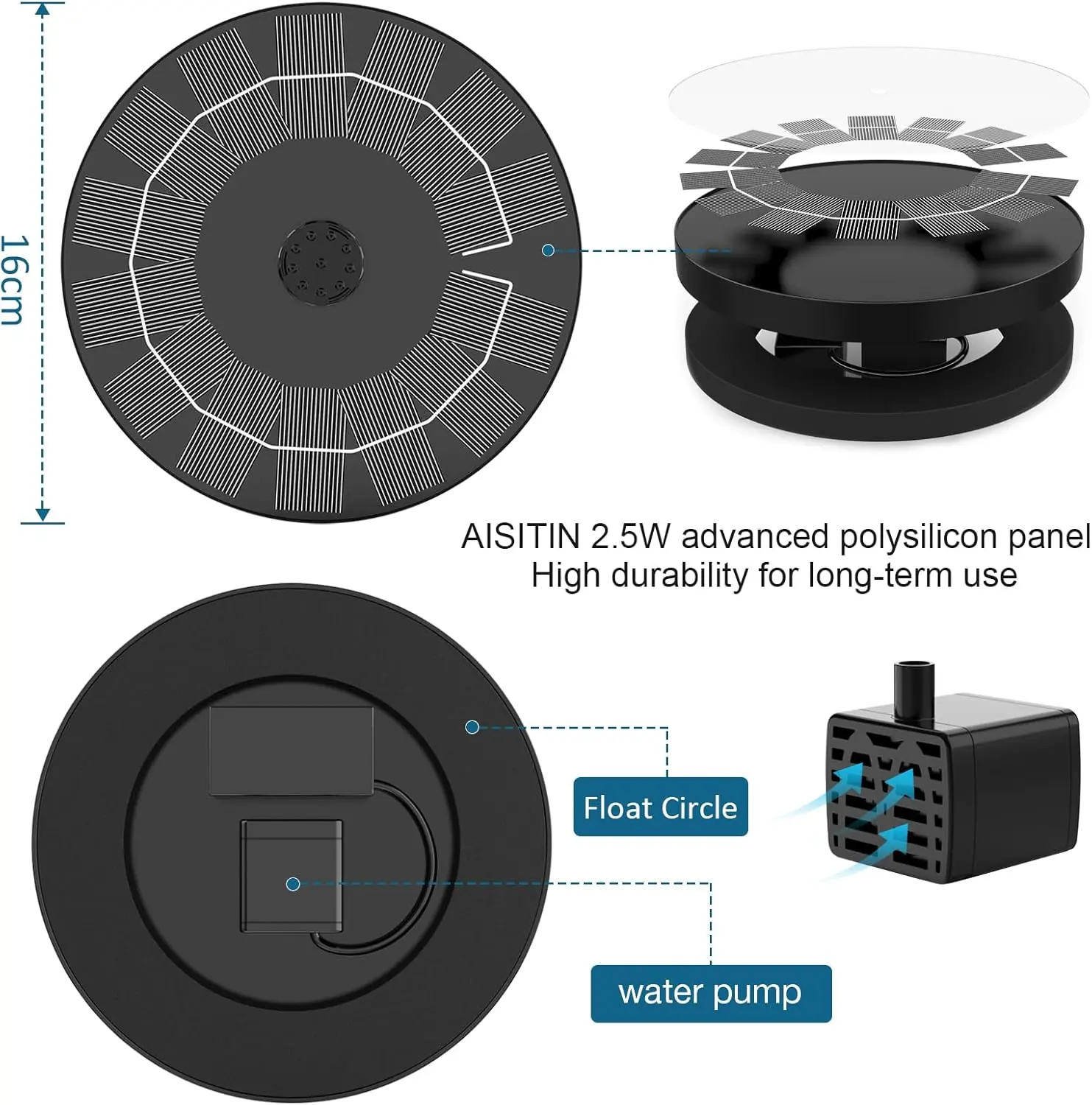 ·【Usage advice】: Make sure you have poured enough water into the basin so that the pump can fall completely underwater. You should clean the pump regularly to avoid clogging with dust. The solar panel needs to be kept clean, and the shading of leaves or stains will affect the conversion of solar energy.