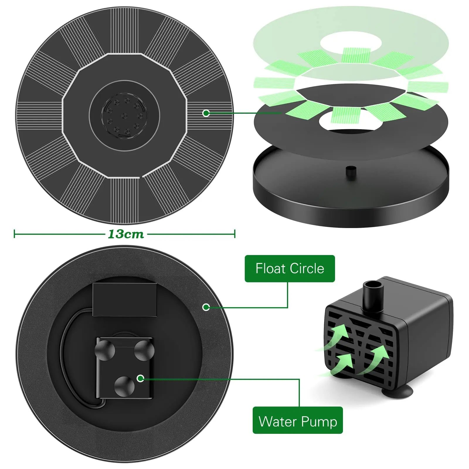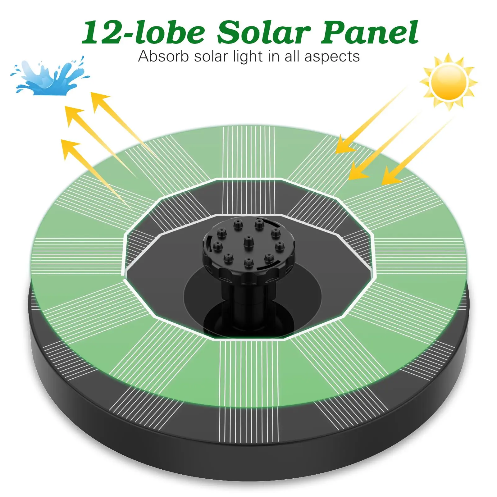 ·Eco-friendly Solar Fountain: The solar water fountain pump is completely powered by solar energy, does not require any power battery, no additional power supply. It is an environmentally friendly product.