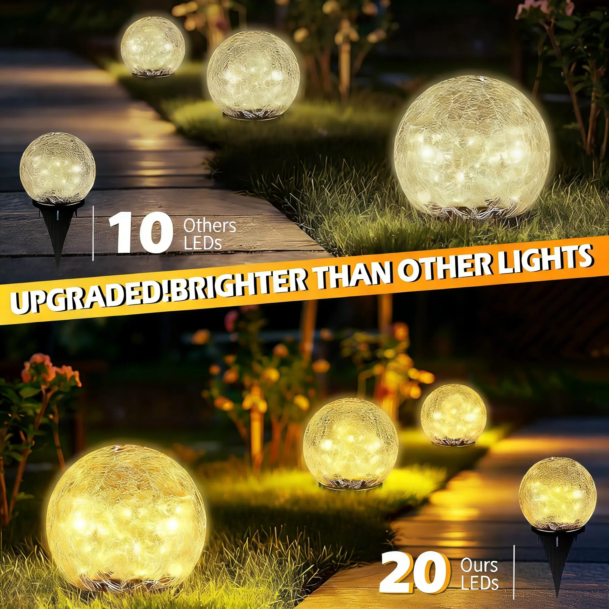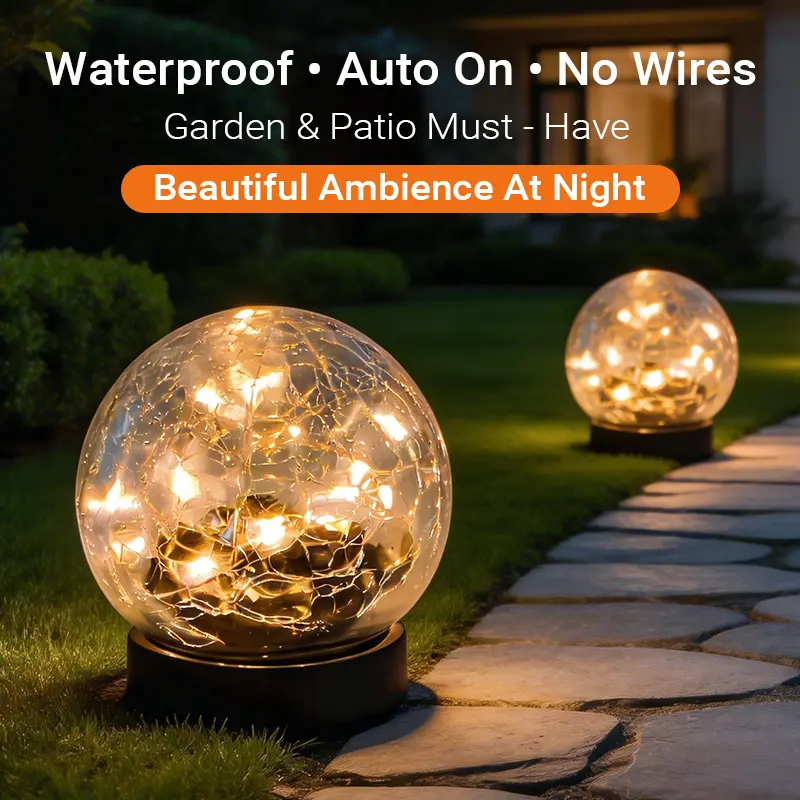 These solar globe lights feature a unique cracked glass design, perfect for adding elegance to your outdoor spaces. The distinctive look enhances the aesthetic appeal of any outdoor area.