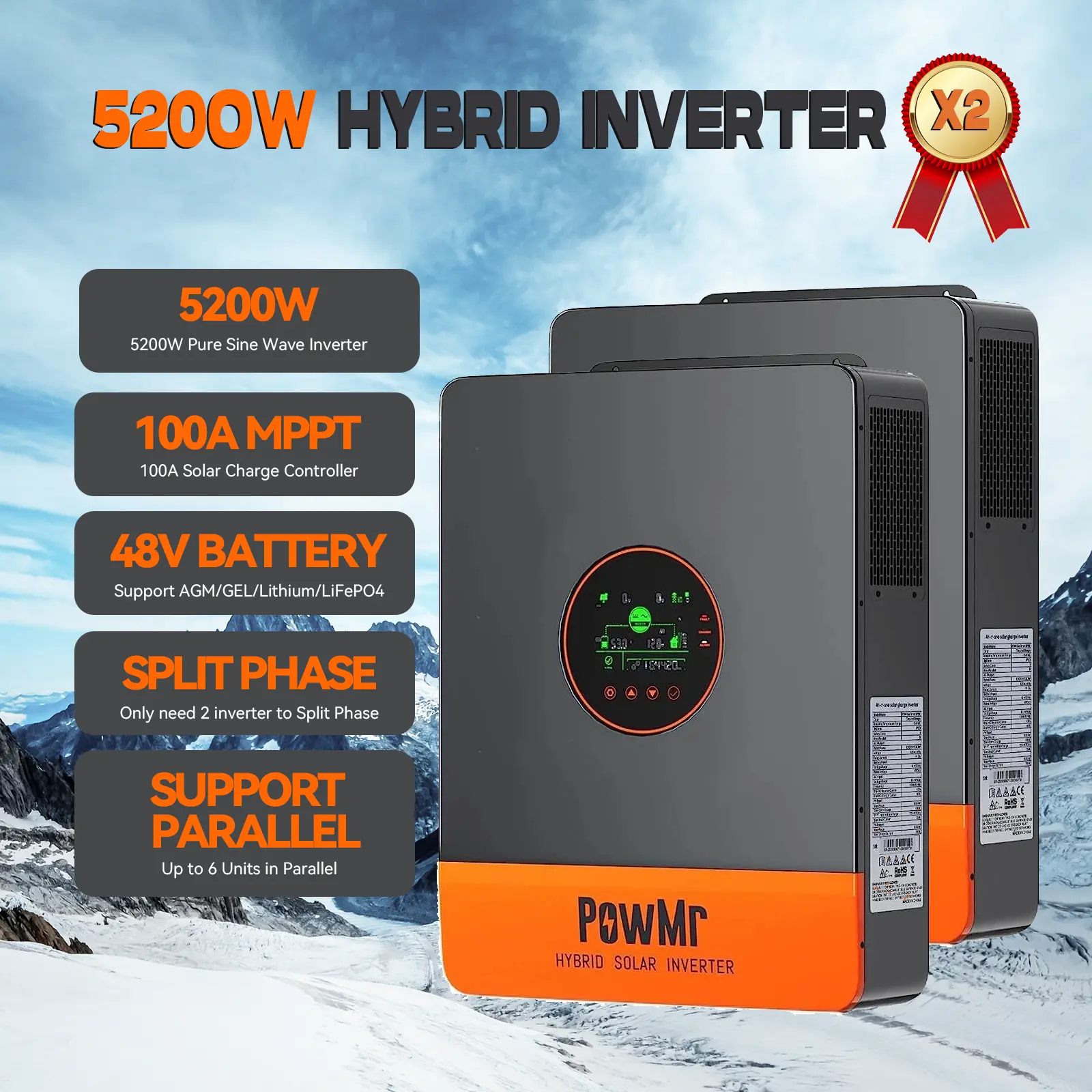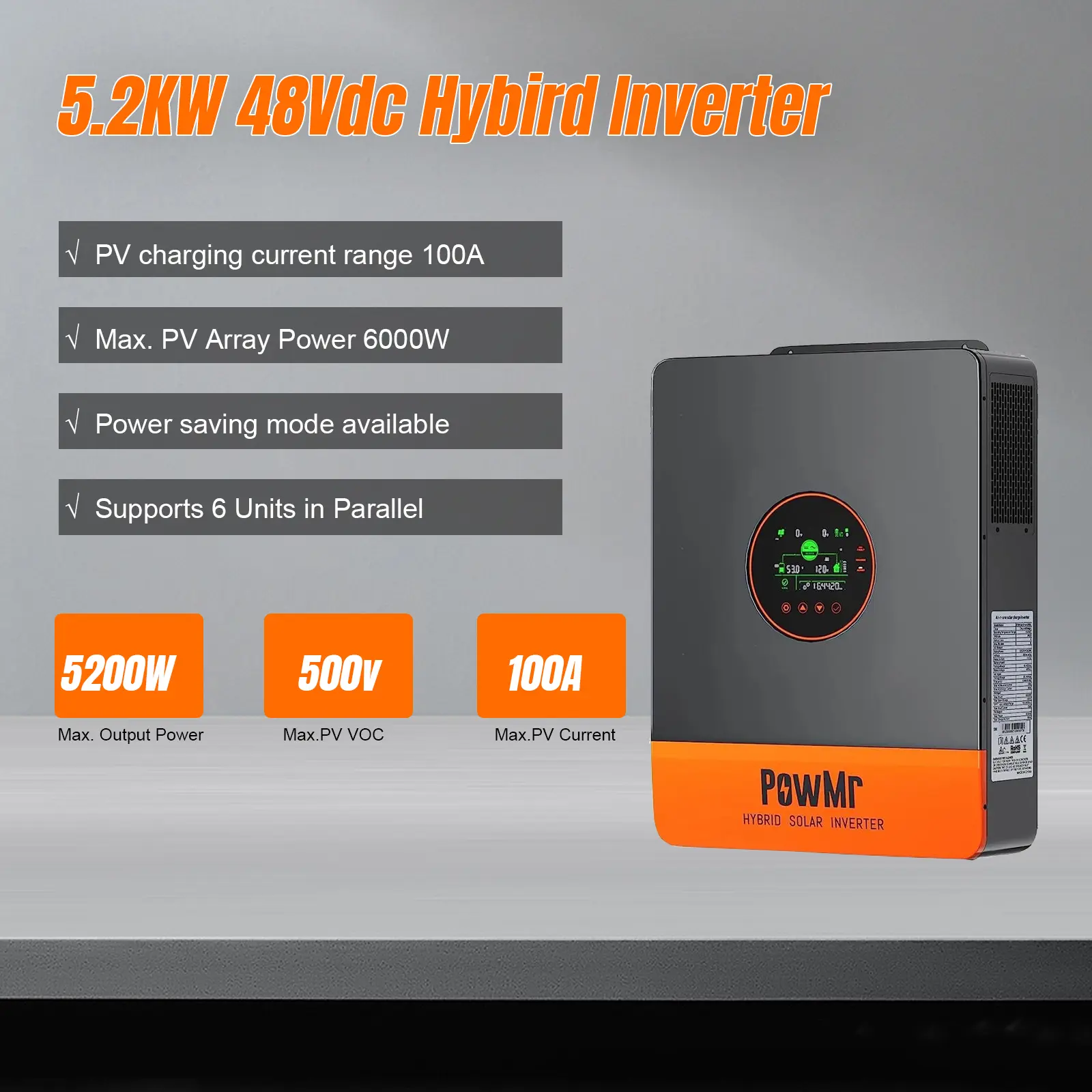 ·Rated output: 5200 VA; max PV input: 6000 W; peak power: 10400 VA