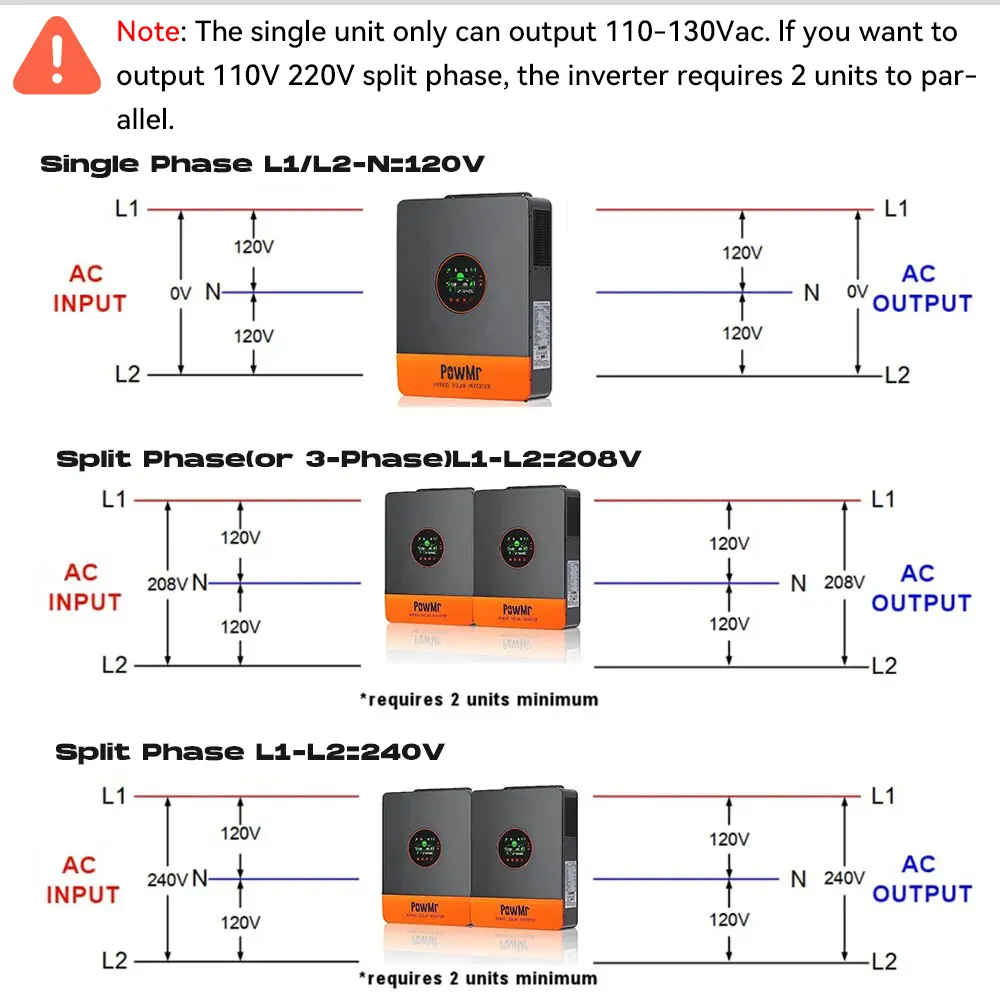 ·Up to 6 units in parallel: 2 for 240 V split-phase, 3 for 208 V 3-phase