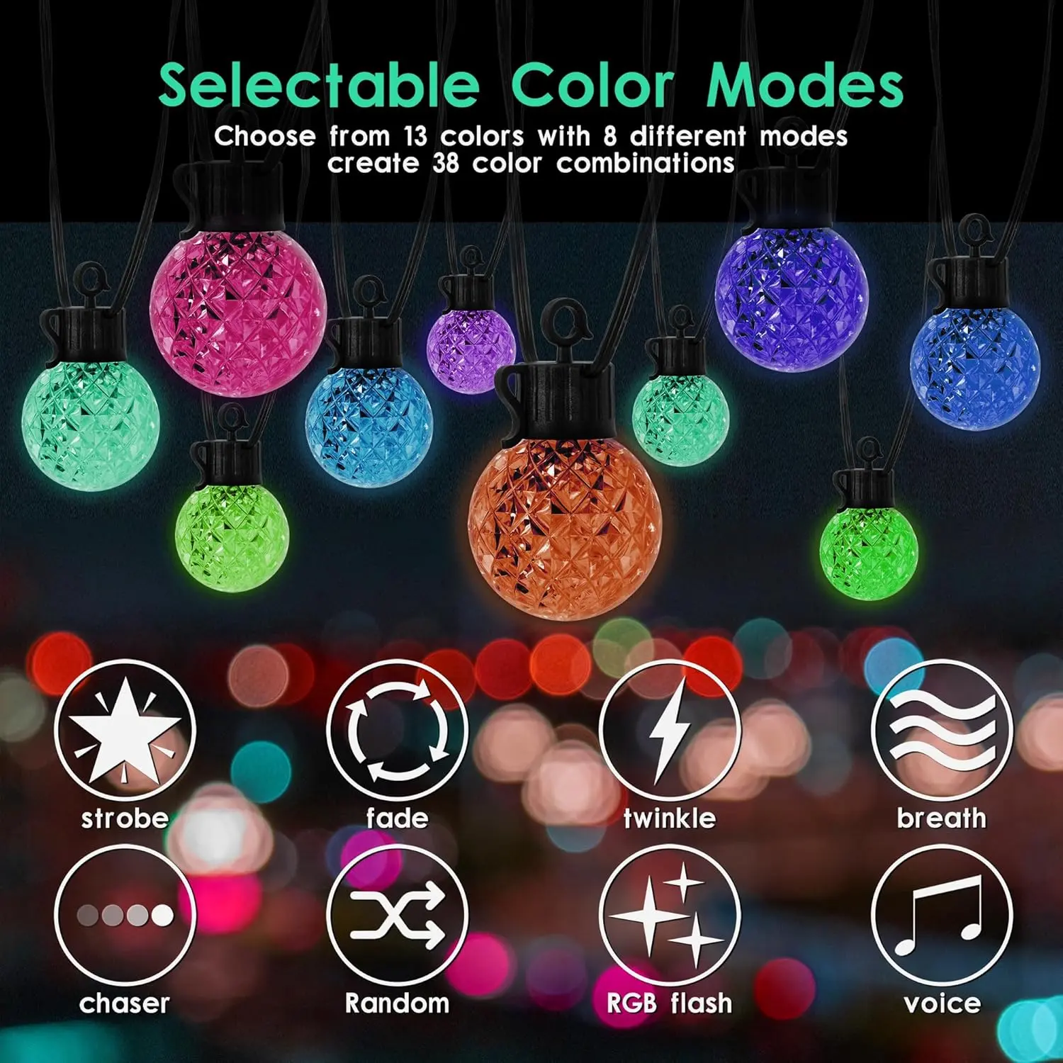 ·Vibrant RGBW Lighting: Experience 16 million colors with our solar-powered LED globe string lights, perfect for creating a dynamic and festive atmosphere at any event, complemented by music-sync capabilities.