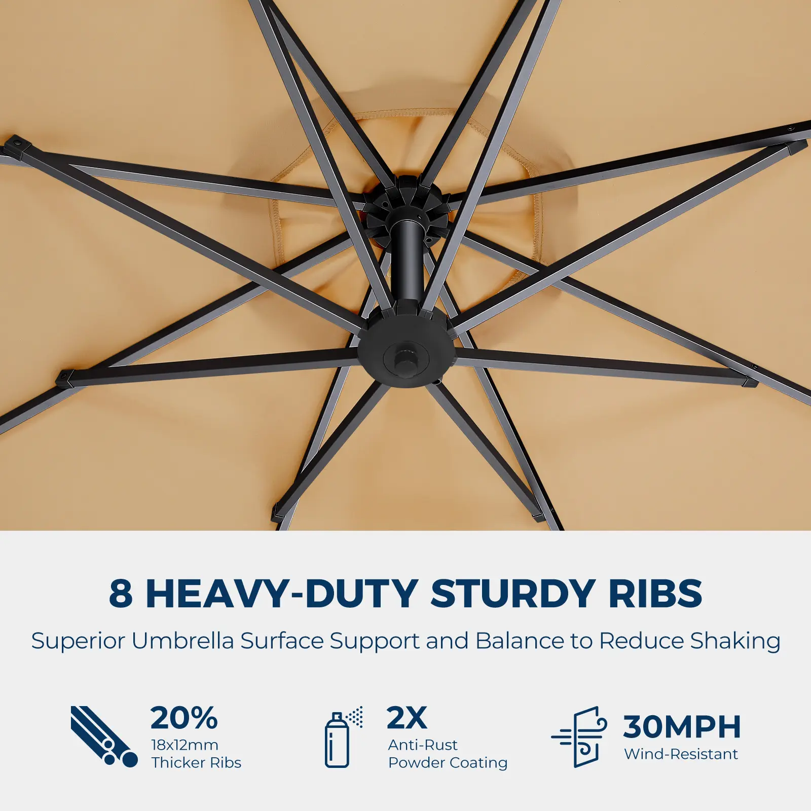 ·HIGH-QUALITY FRAME: Durable 8-rib steel alloy frame with a 1.9-inch umbrella pole. 8 heavy-duty sturdy ribs are 20% thicker(18x12mm), providing superior umbrella surface support and balance to reduce shaking. Can withstand 30 MPH Wind-Resistant. Double powder-coated steel alloy surface brings excellent rust resistance.