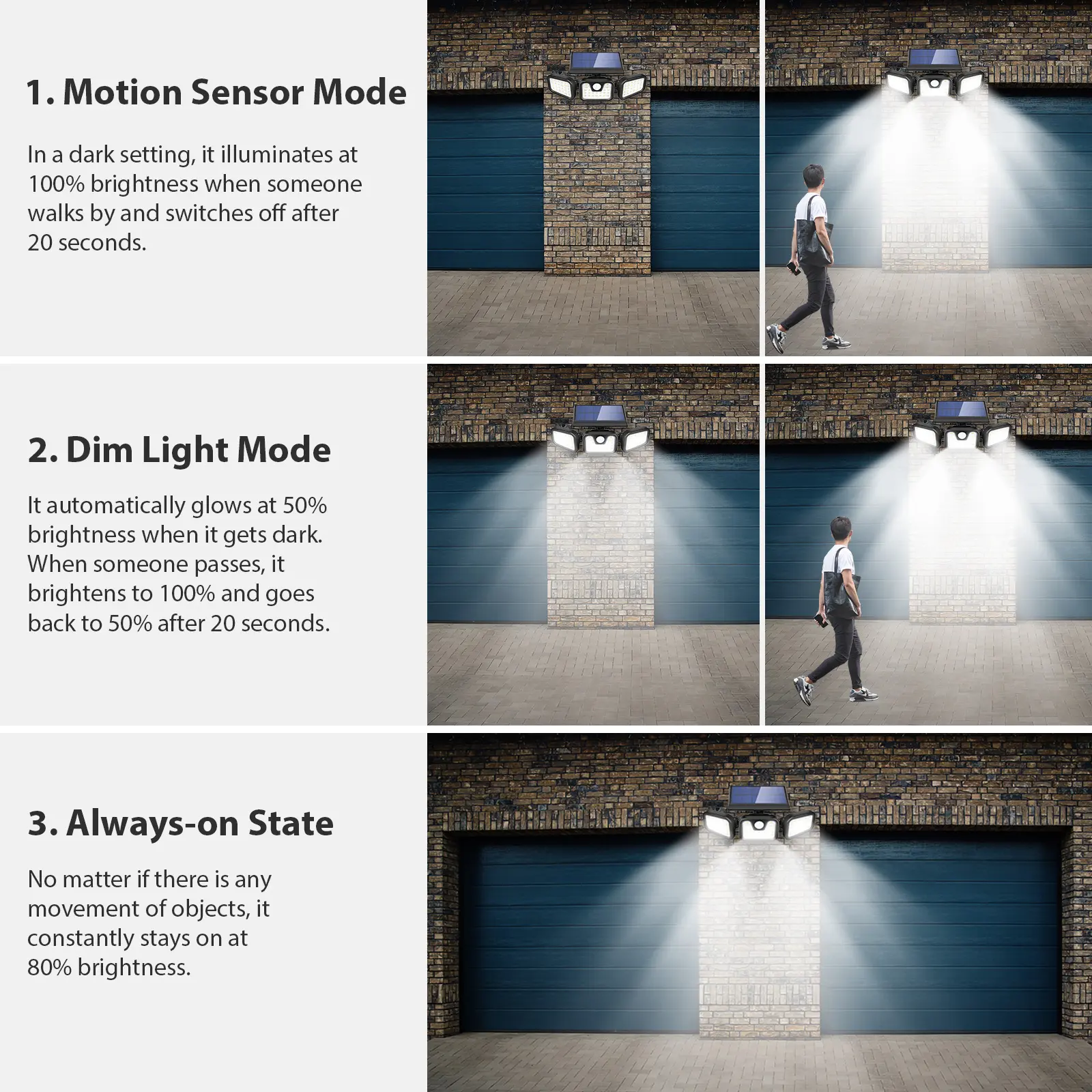 ·Powerful lighting and detection:3 heads design with 74 super bright LED outdoor spotlights, offering an illumination range up to 800 feet and 180° wide-angle illumination, capable of detecting distances up to 33 feet.