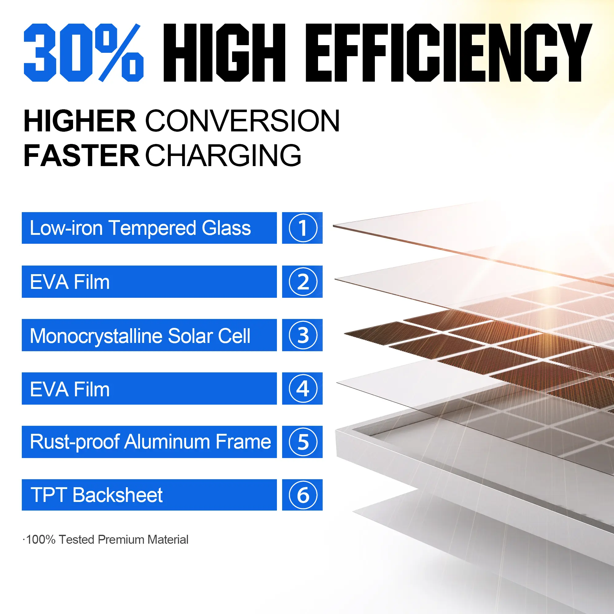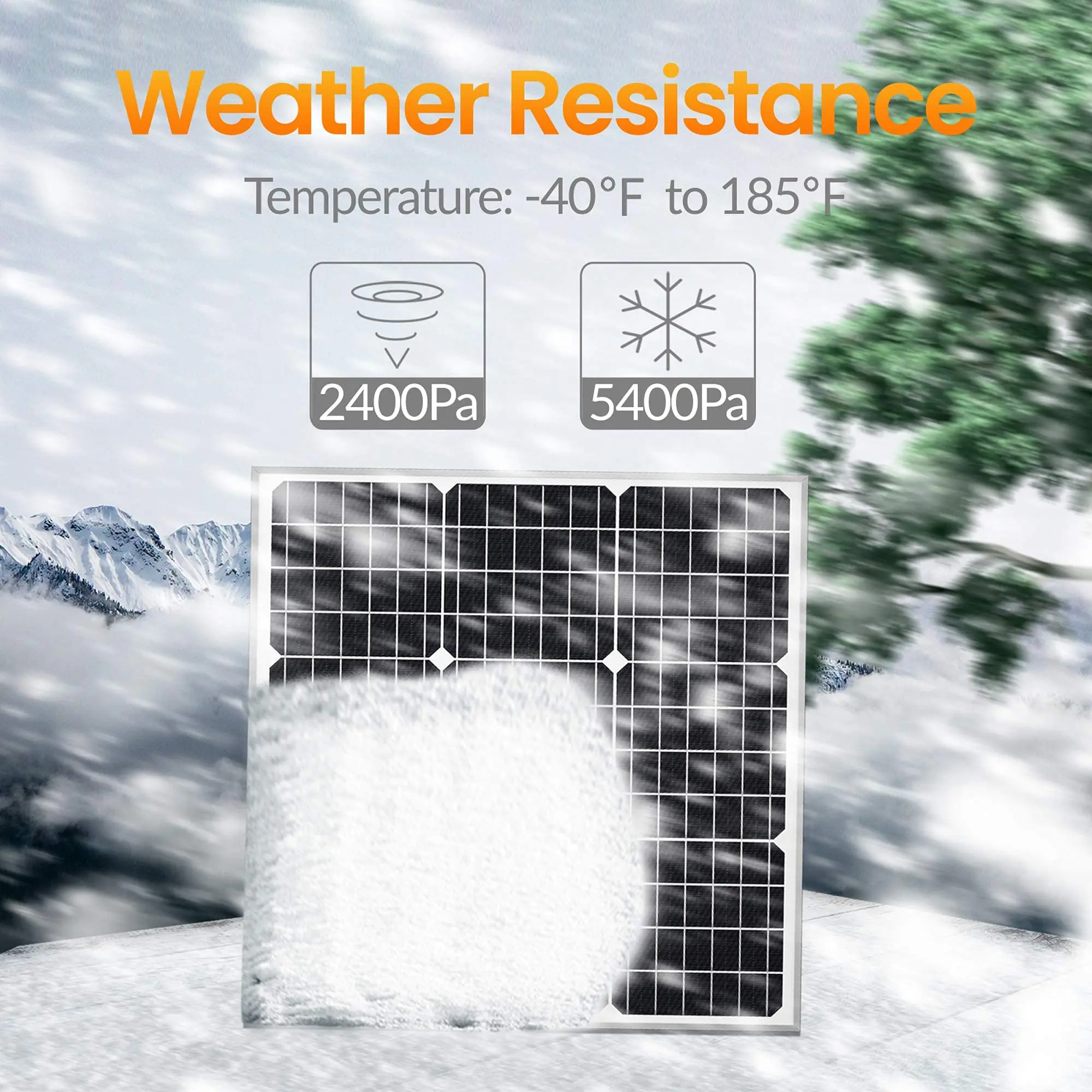 ·【Built to Last】 Low-iron tempered glass surface and corrosion-resistant aluminum frame, make this solar panel 100% waterproof and rustproof and provide a prolonged lifespan of up to 25 years. This 12V solar panel can withstand all weather conditions such as sandstorms, strong winds, thunderstorms, blizzards, hail, etc. It can withstand up to 2400Pa wind pressure and 5400Pa snow load.
