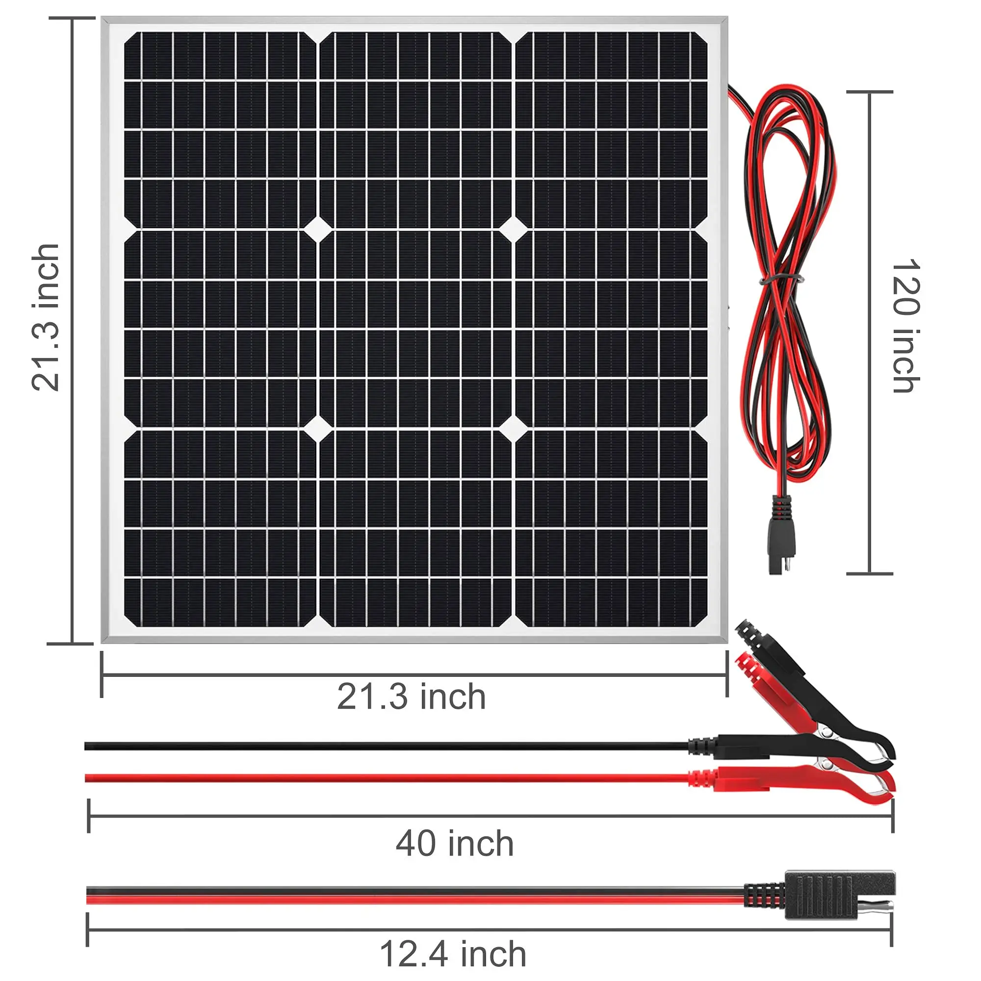 ·【High Efficiency】This 50W solar panel converts sunlight directly into electricity. It has an excellent conversion rate of 21%-30% with high-efficiency monocrystalline solar cells. Designed to charge and maintain 12V rechargeable batteries like LiFePO₄, Lithium Ion, AGM, SLA, GEL, EFB, MF, etc. Suitable for trailer, tractor, truck, boat, motorcycle, RV, car, lawn mower, water pump, gate opener, electric fence, etc.