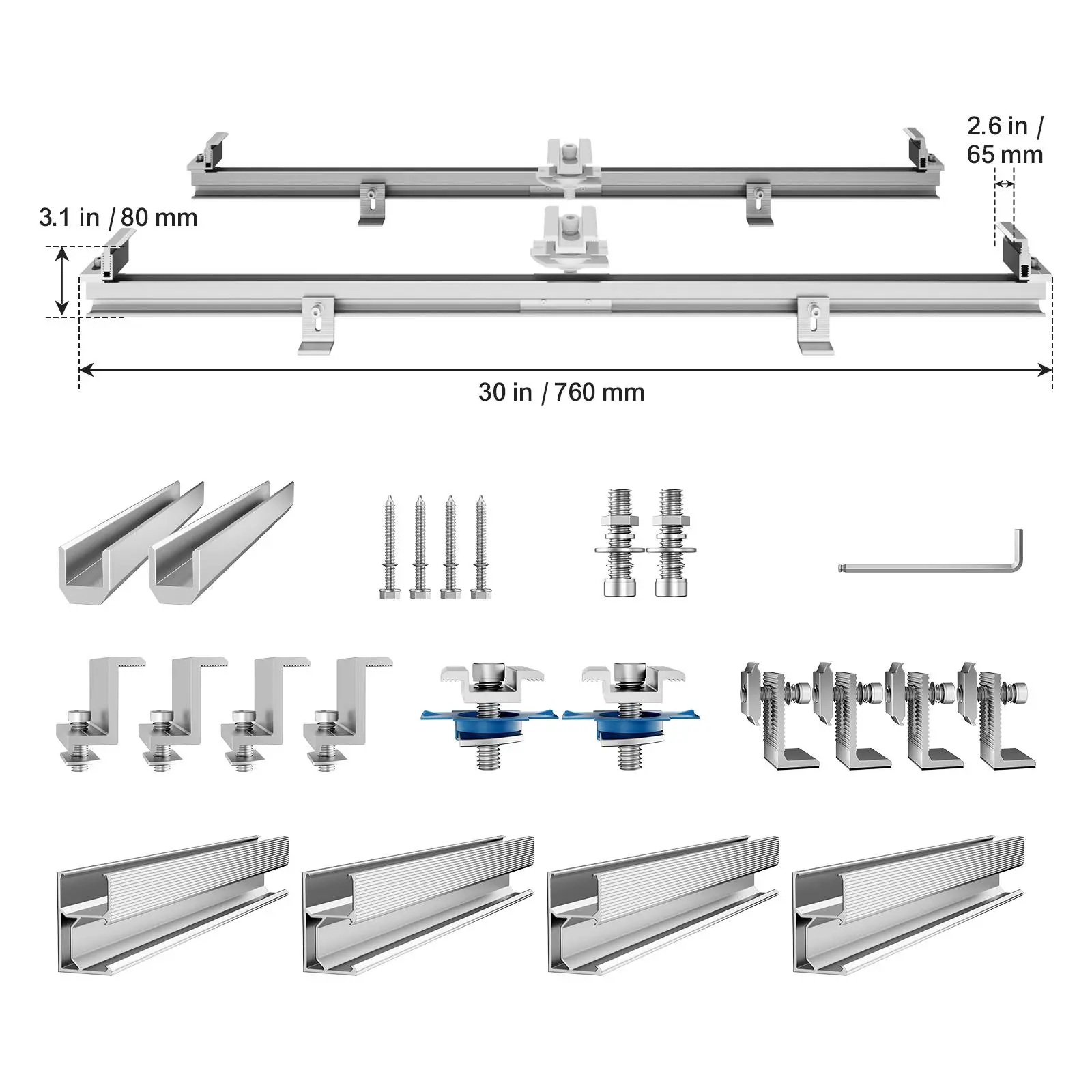 • Easy Installation: This solar panel mounting kit comes with 4 aluminum rails(30-inch), 4 end clamps and 2 mild clamps, a set of accessories and detailed instruction manual, ensuring a quick installation. Users can easily set it up and enjoy stable, reliable support for solar power system.