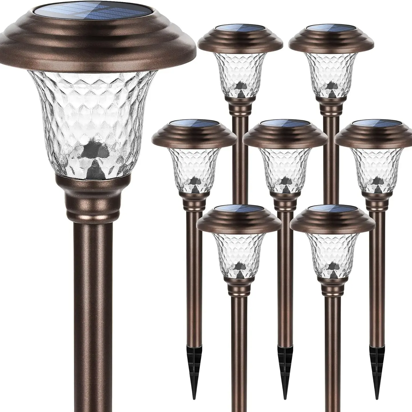 ·【Sturdy Material & Waterproof】The main materials are made of metal and glass, so the solar powered path light has a stronger anti-collision resistance. The appearance color of the lamp is brown. IP65 waterproof rating, so the solar pathway light can work in rainy, cloudy, and small snowy.