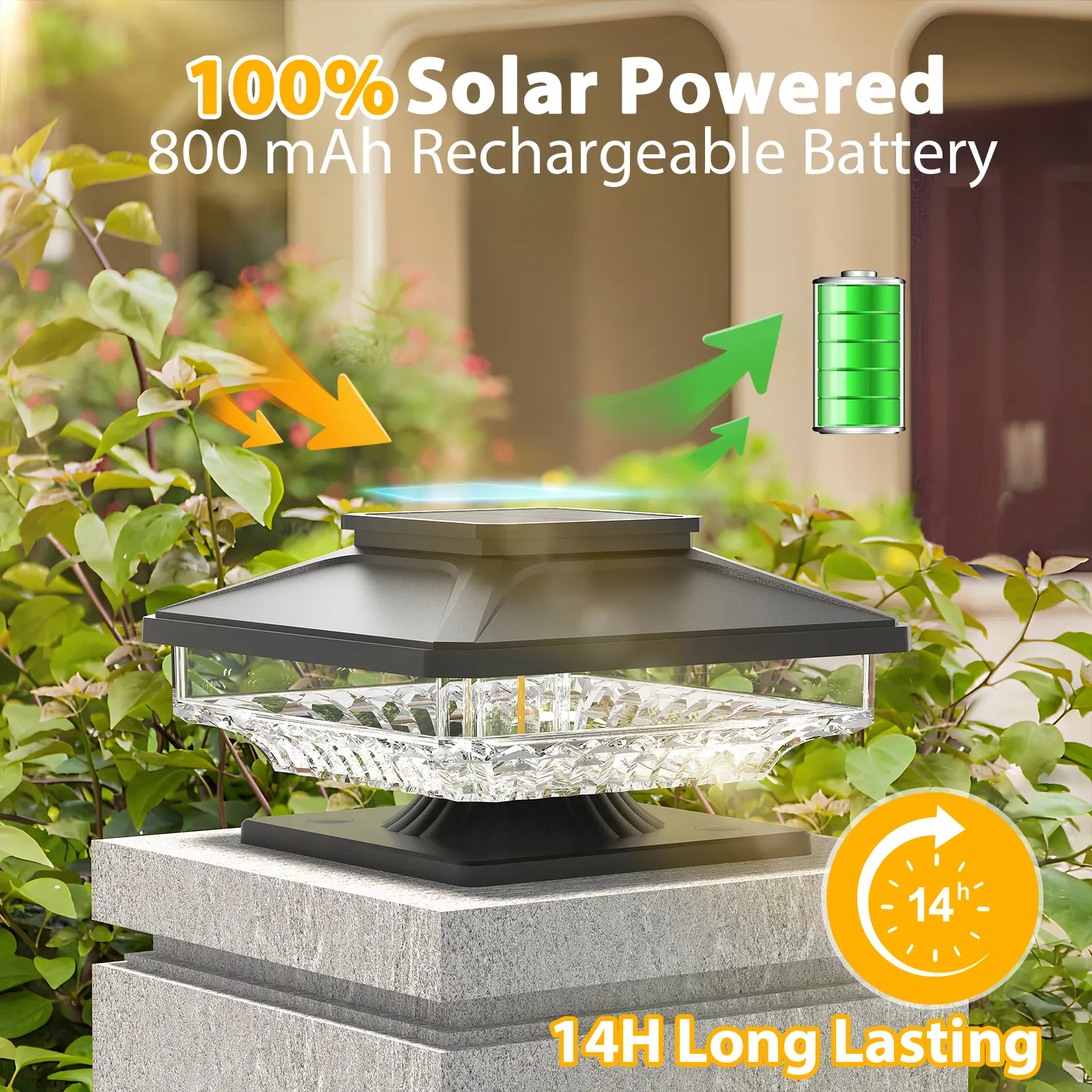 【Upgrade Solar Panel & Longer Lasting】The fence post lights are equipped with a bigger solar panel with a 33% higher conversion rate. Even in winter or less sunny weather, outdoor solar post lights can still maintain the high working efficiency.