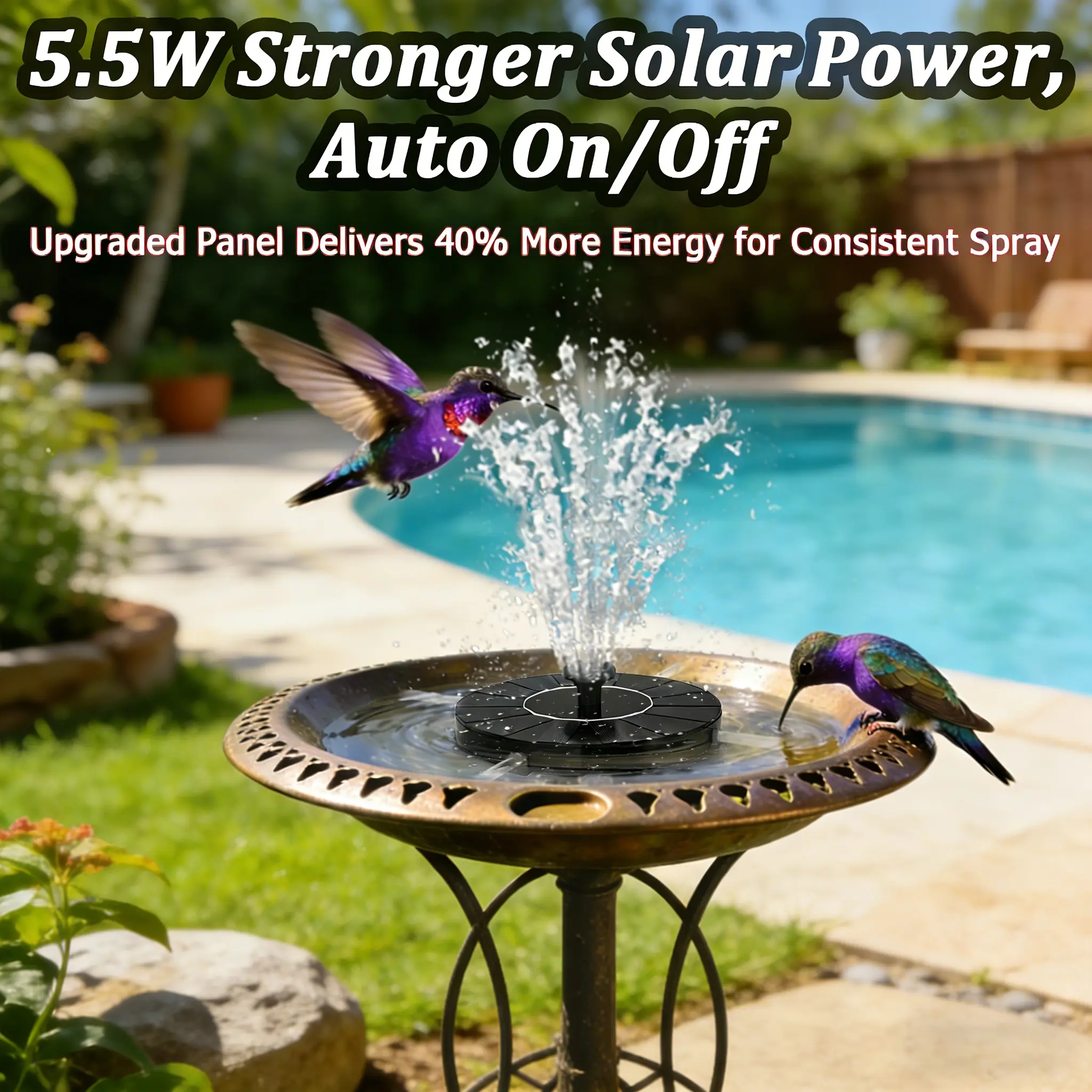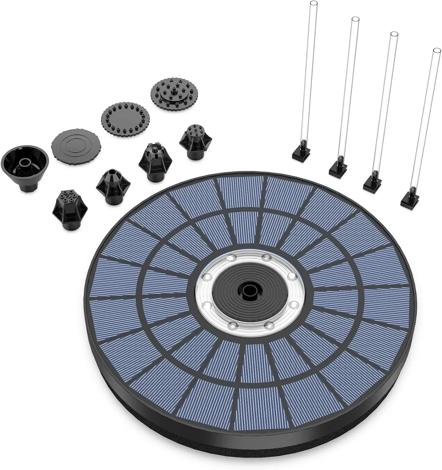 ·【8 Coloured LED】Solar Pond Fountain has 8 built-in LED lights, each with an automatic cycle of switching functions to display different colourful water patterns. At night, the fountain works automatically and lights up when the light-sensing system detects the intensity of light at night. Suitable for bird ponds, fish tanks, small ponds, swimming pools and garden decoration.