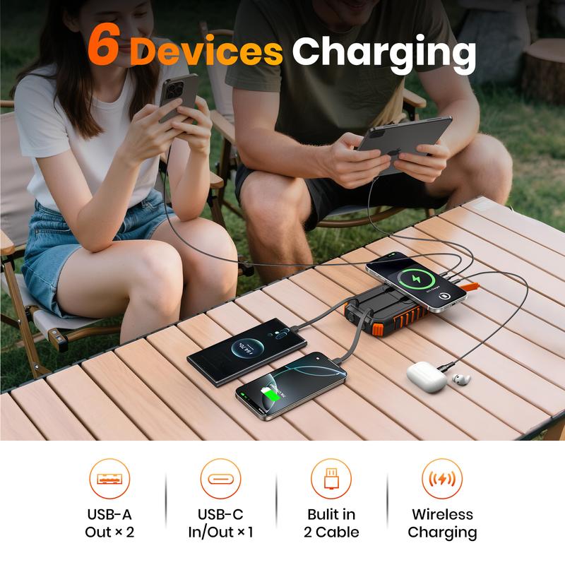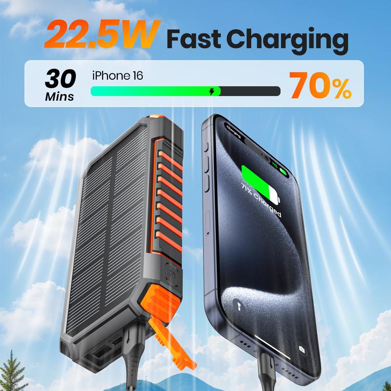 6 Devices at Once: It is also equipped with 3 ports (USB C*1& USB A*2). 22.5W fast charging solar power bank reduces charging time and is up to 50% faster. Along with 2 charging cables and wireless charging, it supports charging 6 devices simultaneously. From now on, there is no need to carry multiple cables anymore! Sharing with families and friends is perfect.