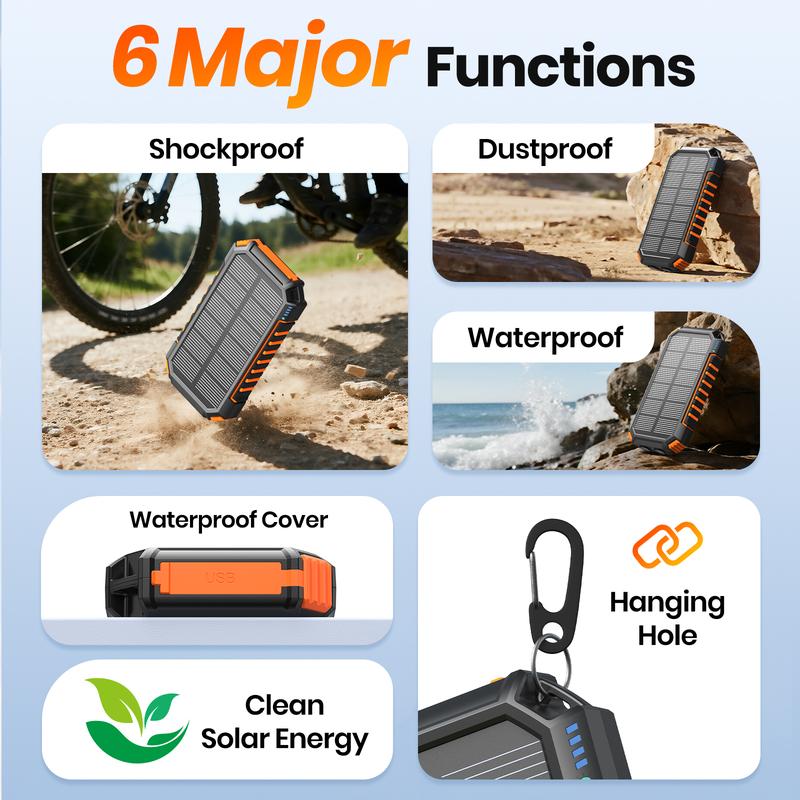 Sturdy &Durable Design: Solar battery pack is made of robust professional ABS material with superior surface hardness, and toughness. It is waterproof, shockproof, and dustproof, eliminating concerns about damage from water or falls. This solar portable charger has dual bright LED flashlights with 3 modes (SOS/Strobe/Steady). Press and hold for three seconds to switch on the light for power outages and other emergencies.