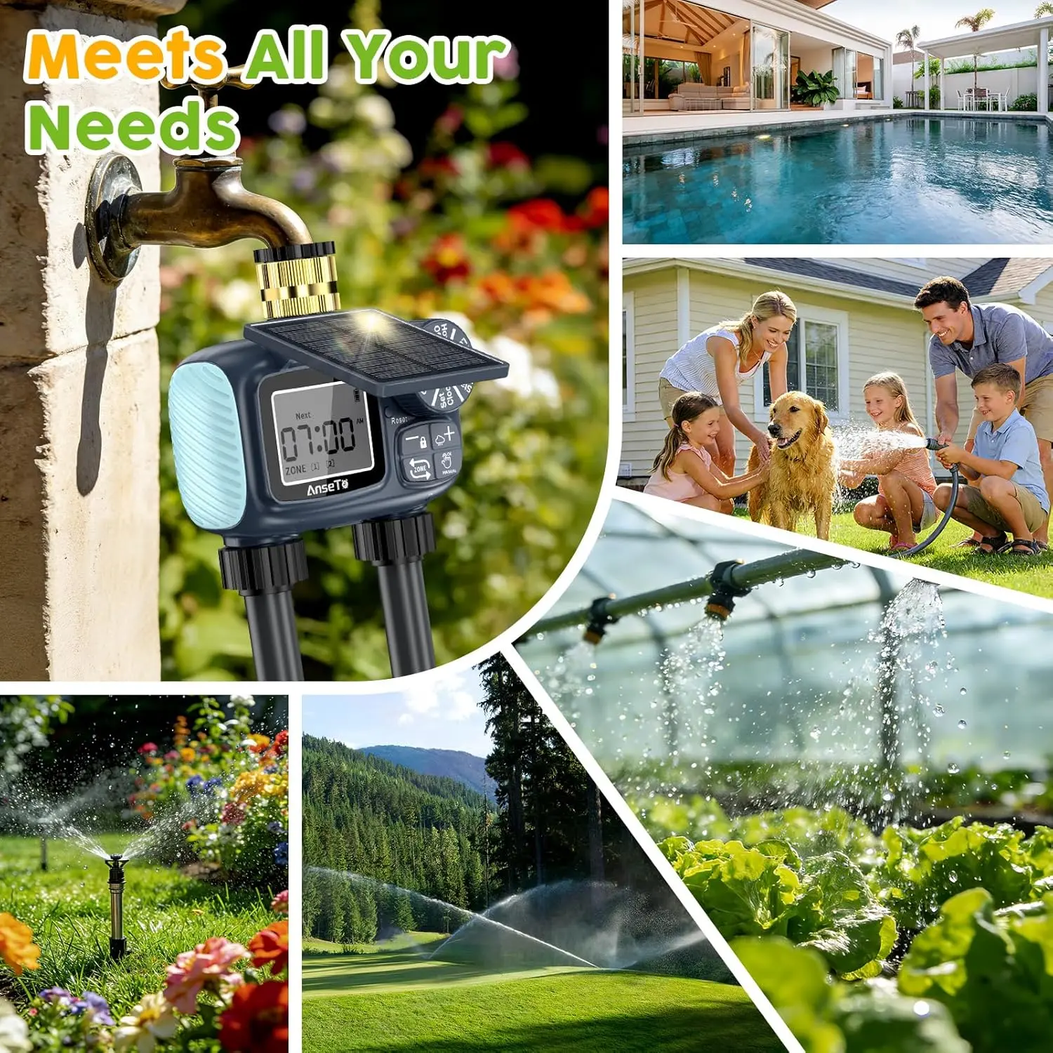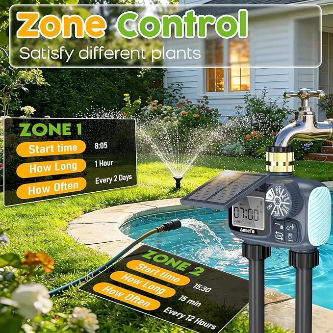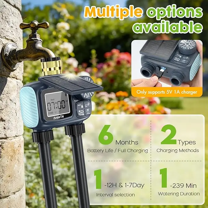 ·【Solar-Powered & Energy-Saving】Equipped with a high-efficiency solar panel and built-in rechargeable battery(Type-C Charging) , the sprinkler timer achieves true energy conservation and environmental protection. It can work continuously, avoiding the trouble of frequent battery replacement and saving your time and cost.