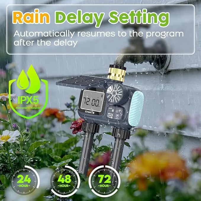 ·【Rain Delay & Child Lock】This solar hose timer offers dual protection and convenience. The rain delay function allows you to preset watering schedule for 24H/48H/72H when it rains, avoiding overwatering, saving water and protecting plant roots. The child lock function effectively prevents misoperation by kids or pets, avoiding accidental setting changes.