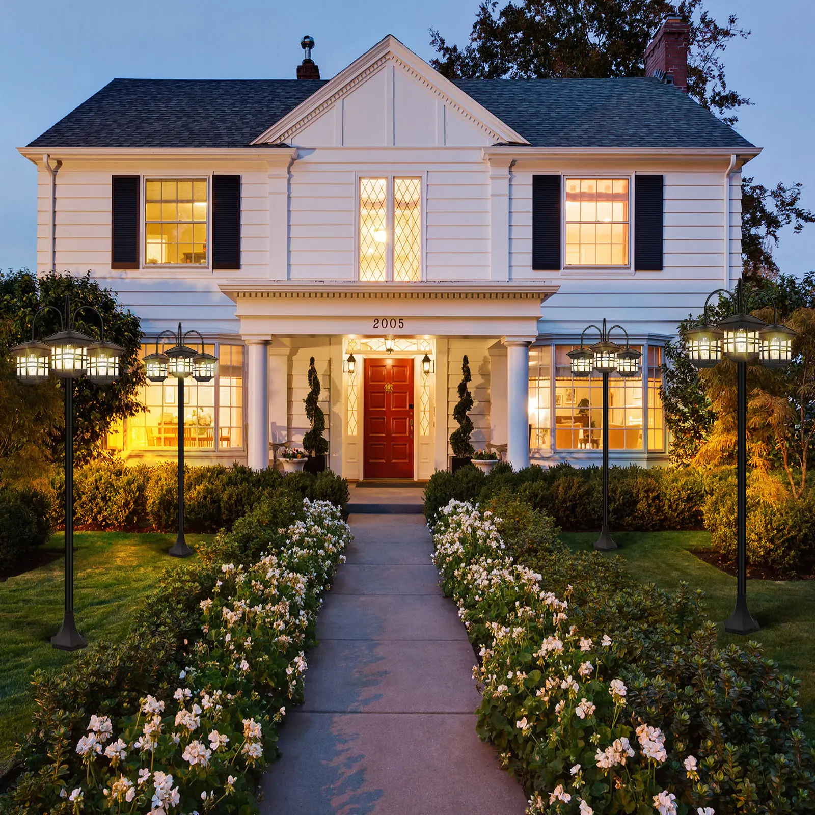·High-efficiency solar panel: Solar lamp post light each lantern uses 4 high-efficiency solar panels, which can collect solar energy 360° all day long, and it only takes 6-8 hours to charge. The solar pole lights will automatically turn on at dusk and turn off at dawn.