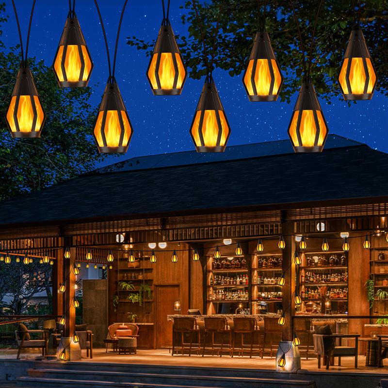 This solar string light is equipped with 15 LED bulbs, each featuring a flame-flickering effect that creates a warm illusion. The dark black wires and bases can blend into the night, leaving only the flickering "flames" visible. This string light is suitable for decorating Christmas trees, courtyards, patios, and garden parties.