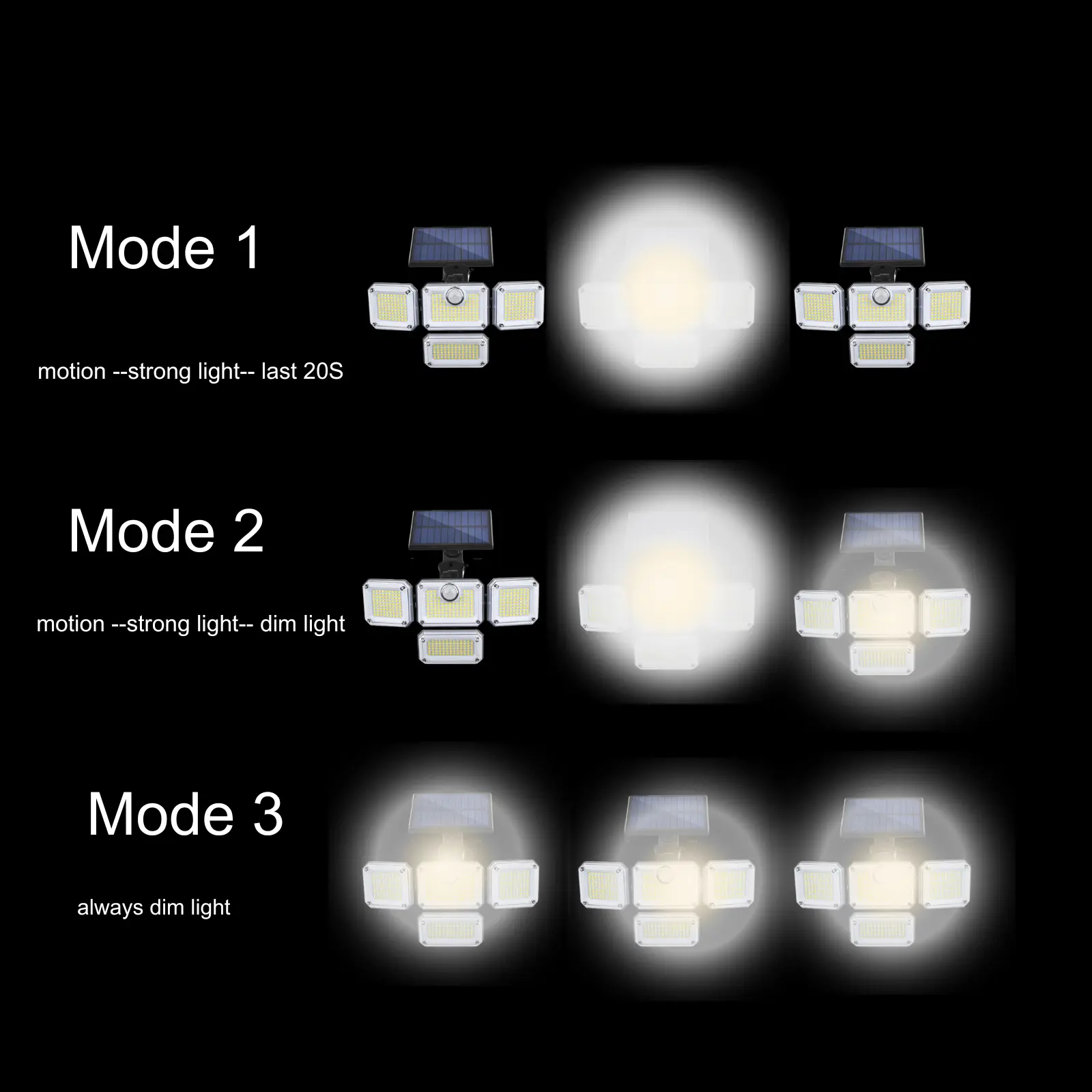 Motion-Activated Mode: High brightness triggers on movement, then shuts off after 20 seconds.