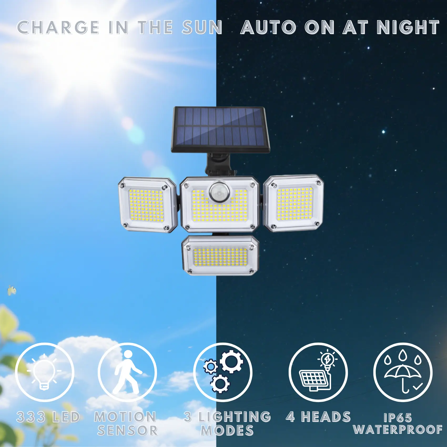 With 330 premium LEDs and a 2400mAh high-efficiency battery, these 4-head solar flood lights charge fully in 6–8 hours and shine all night long—ideal for security and landscape lighting.